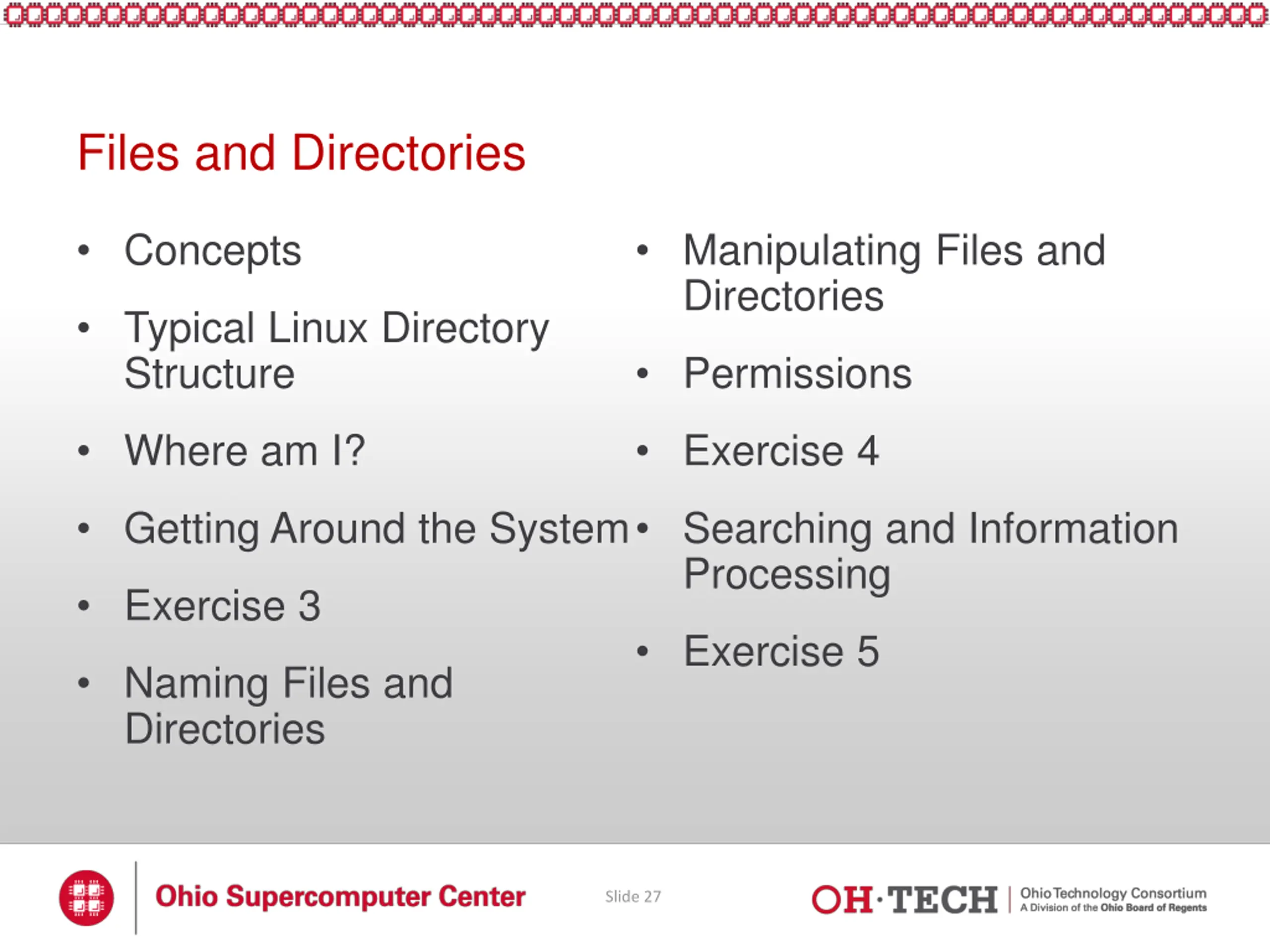 Files and Directories Concepts Manipulating Files and Directories Typical Linux Directory Structure Permissions Where am I? Exercise 4 Getting Around the System Searching and Information Processing Exercise 3 Exercise 5 Naming Files and Directories Slide 27