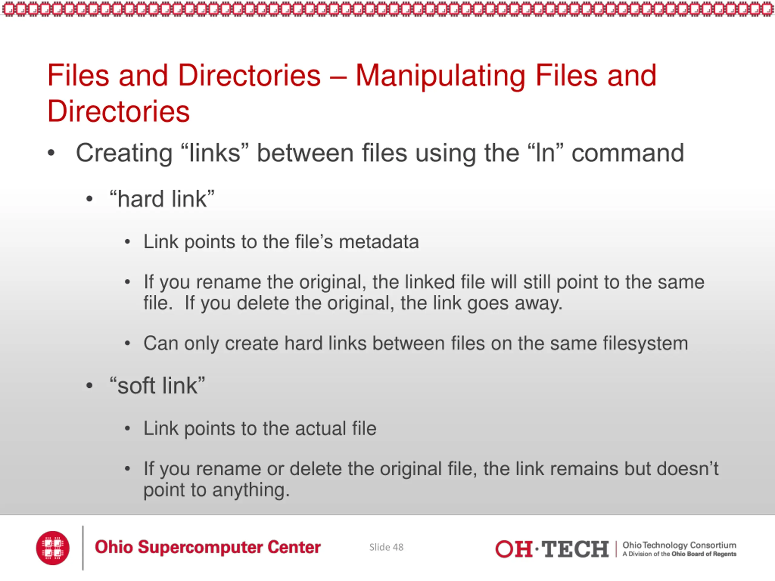 Files and Directories Manipulating Files and Directories Creating links between files using the ln command hard link Link points to the file s metadata If you rename the original, the linked file will still point to the same file. If you delete the original, the link goes away. Can only create hard links between files on the same filesystem soft link Link points to the actual file If you rename or delete the original file, the link remains but doesn t point to anything. Slide 48