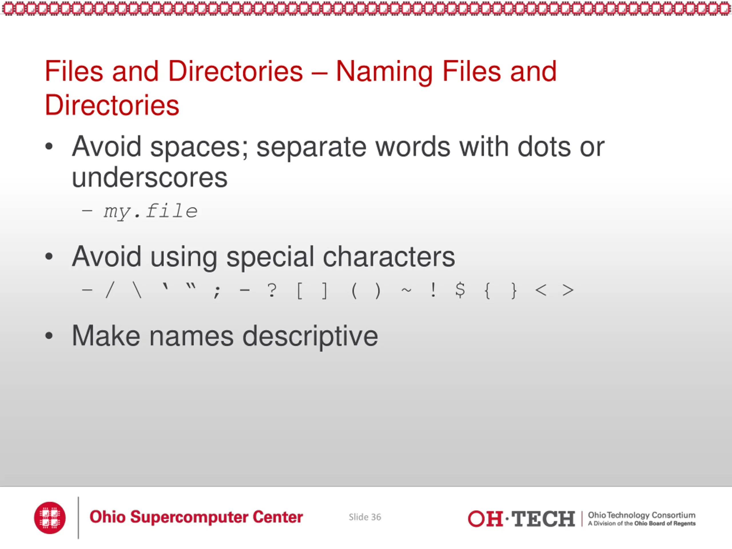 Files and Directories Naming Files and Directories Avoid spaces; separate words with dots or underscores my.file Avoid using special characters / \ ; - ? [ ] ( ) ~ ! $ { } < > Make names descriptive Slide 36