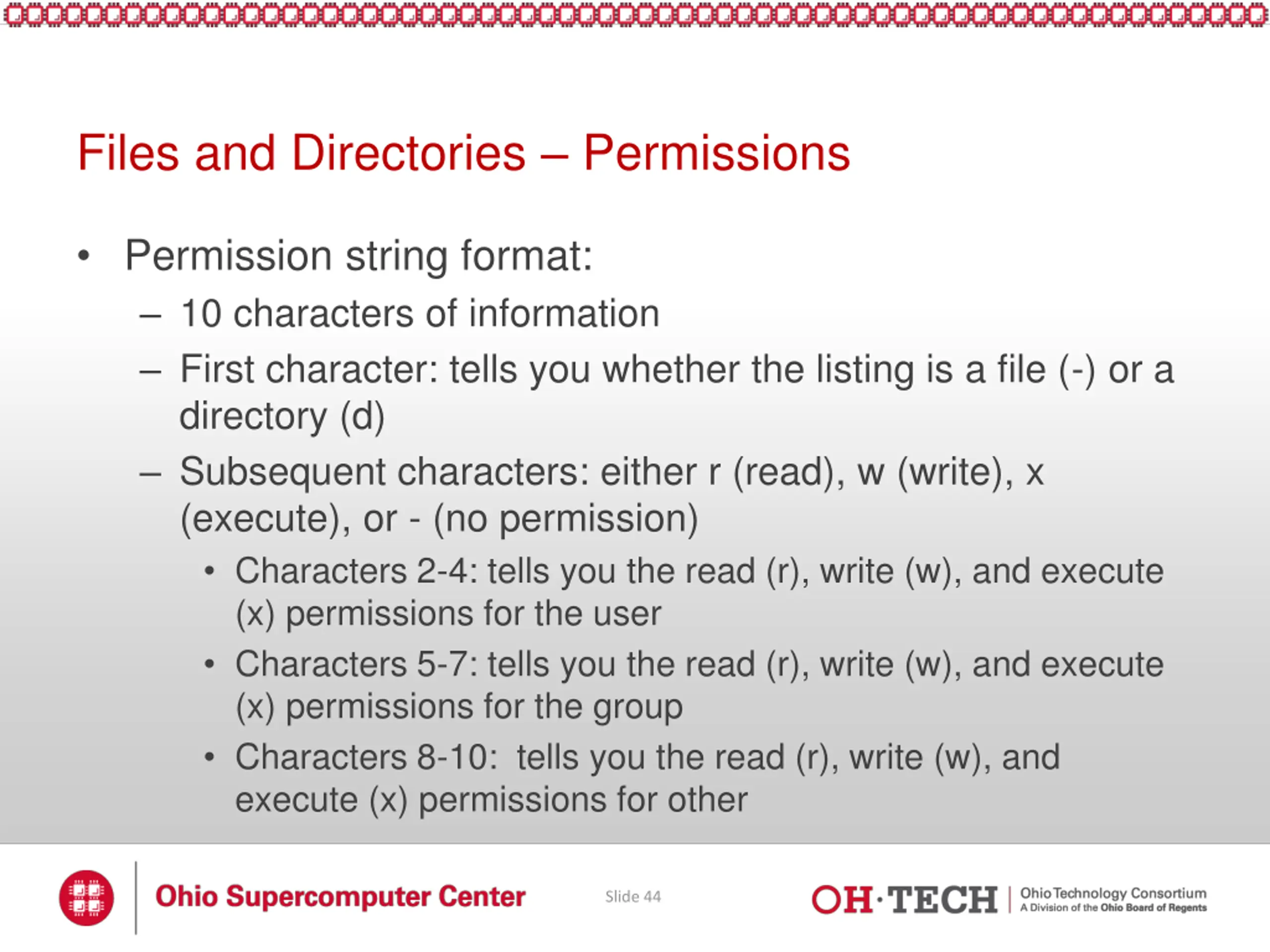 Files and Directories Permissions Permission string format: 10 characters of information First character: tells you whether the listing is a file (-) or a directory (d) Subsequent characters: either r (read), w (write), x (execute), or - (no permission) Characters 2-4: tells you the read (r), write (w), and execute (x) permissions for the user Characters 5-7: tells you the read (r), write (w), and execute (x) permissions for the group Characters 8-10: tells you the read (r), write (w), and execute (x) permissions for other Slide 44