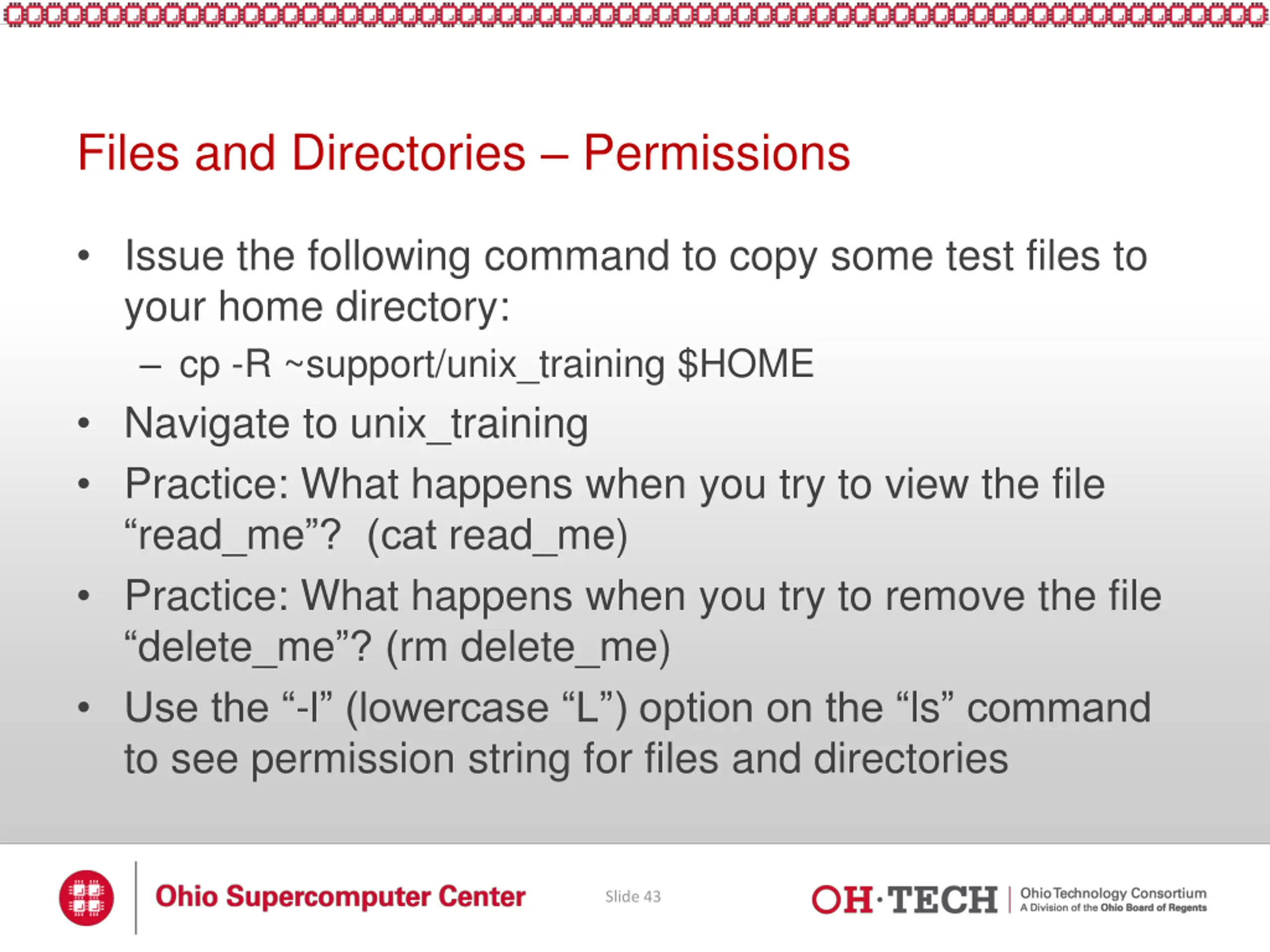 Files and Directories Permissions Issue the following command to copy some test files to your home directory: cp -R ~support/unix_training $HOME Navigate to unix_training Practice: What happens when you try to view the file read_me ? (cat read_me) Practice: What happens when you try to remove the file delete_me ? (rm delete_me) Use the -l (lowercase L ) option on the ls command to see permission string for files and directories Slide 43