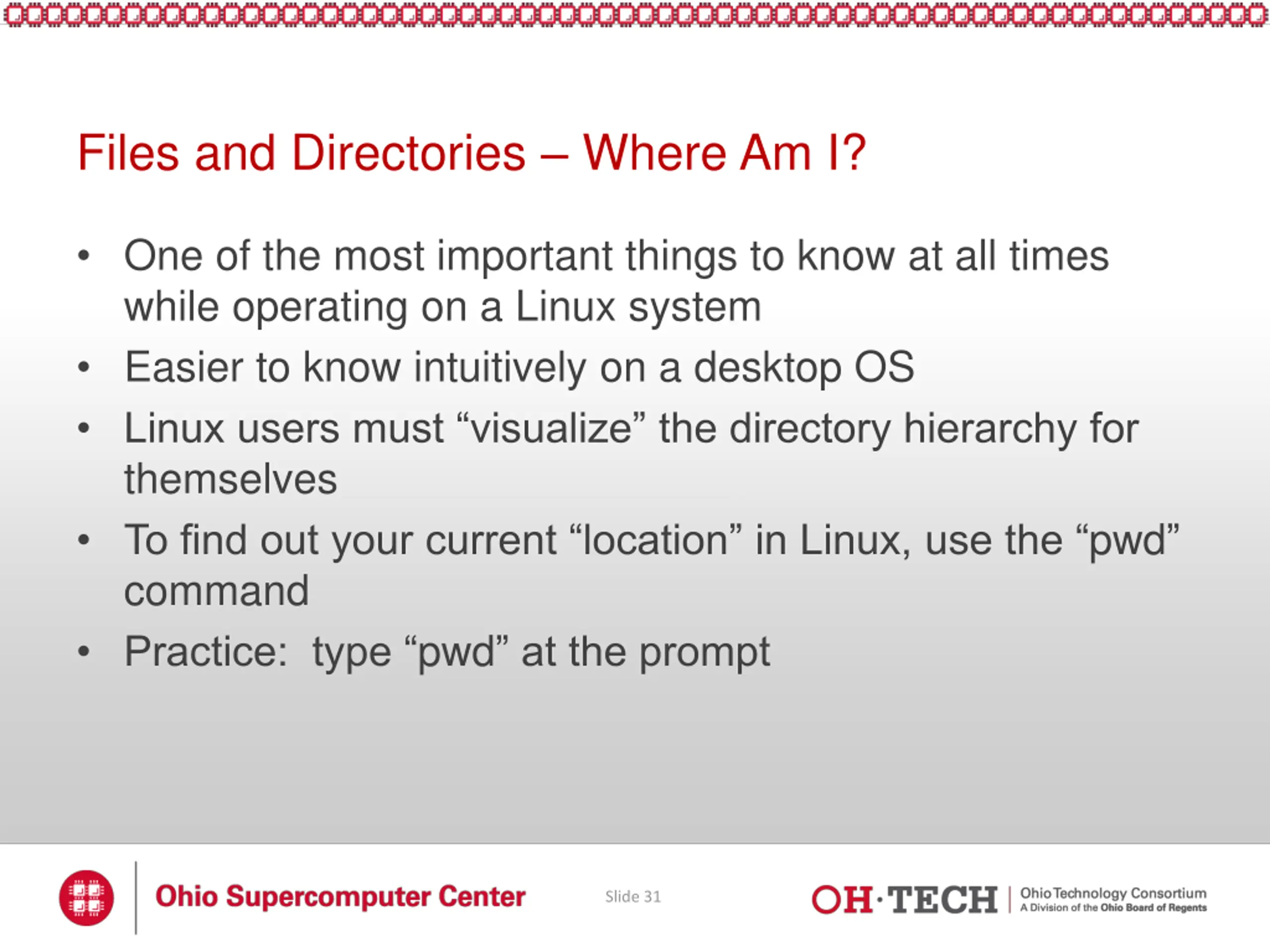 Files and Directories Where Am I? One of the most important things to know at all times while operating on a Linux system Easier to know intuitively on a desktop OS Linux users must visualize the directory hierarchy for themselves To find out your current location in Linux, use the pwd command Practice: type pwd at the prompt Slide 31