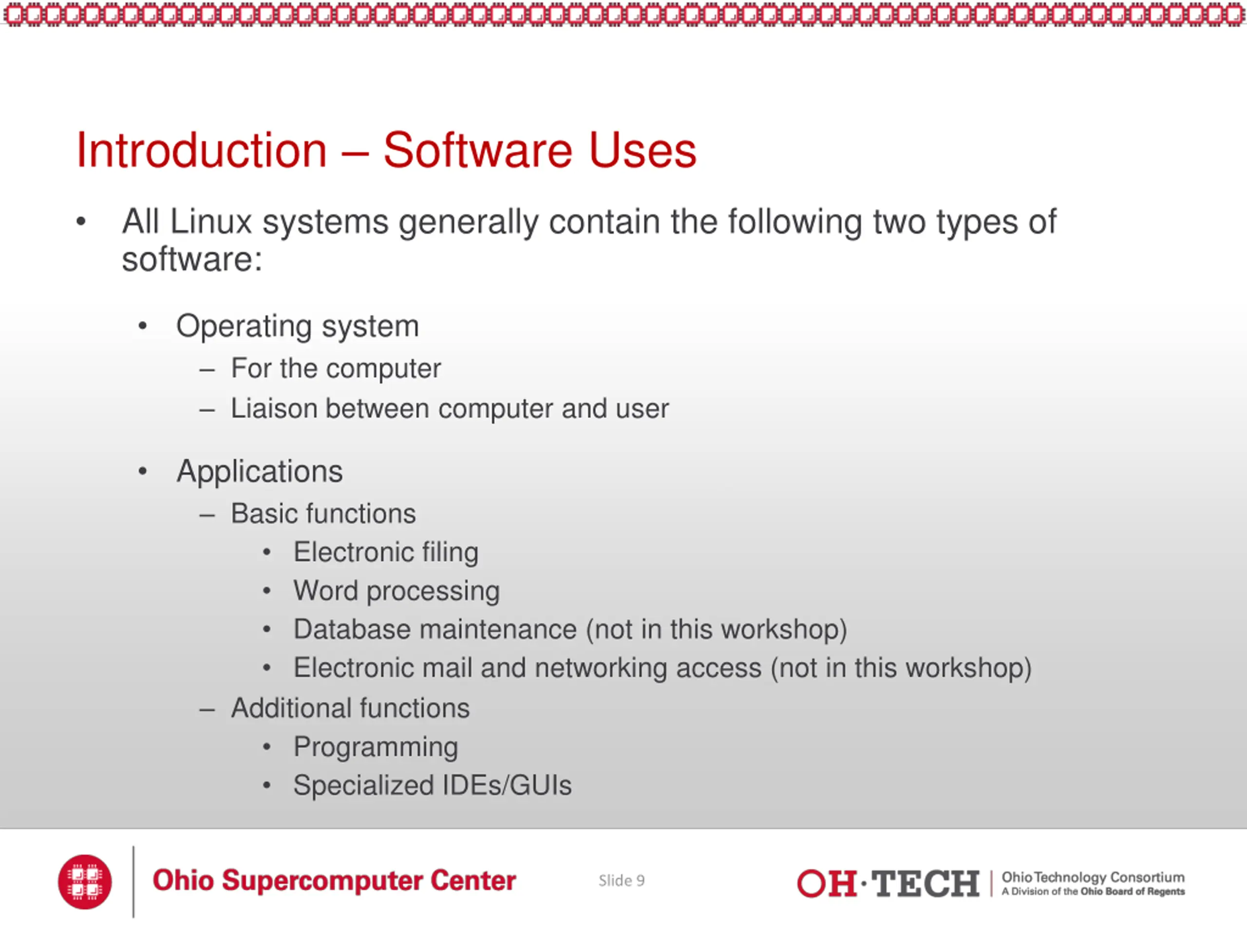 Introduction Software Uses All Linux systems generally contain the following two types of software: Operating system For the computer Liaison between computer and user Applications Basic functions Electronic filing Word processing Database maintenance (not in this workshop) Electronic mail and networking access (not in this workshop) Additional functions Programming Specialized IDEs/GUIs Slide 9