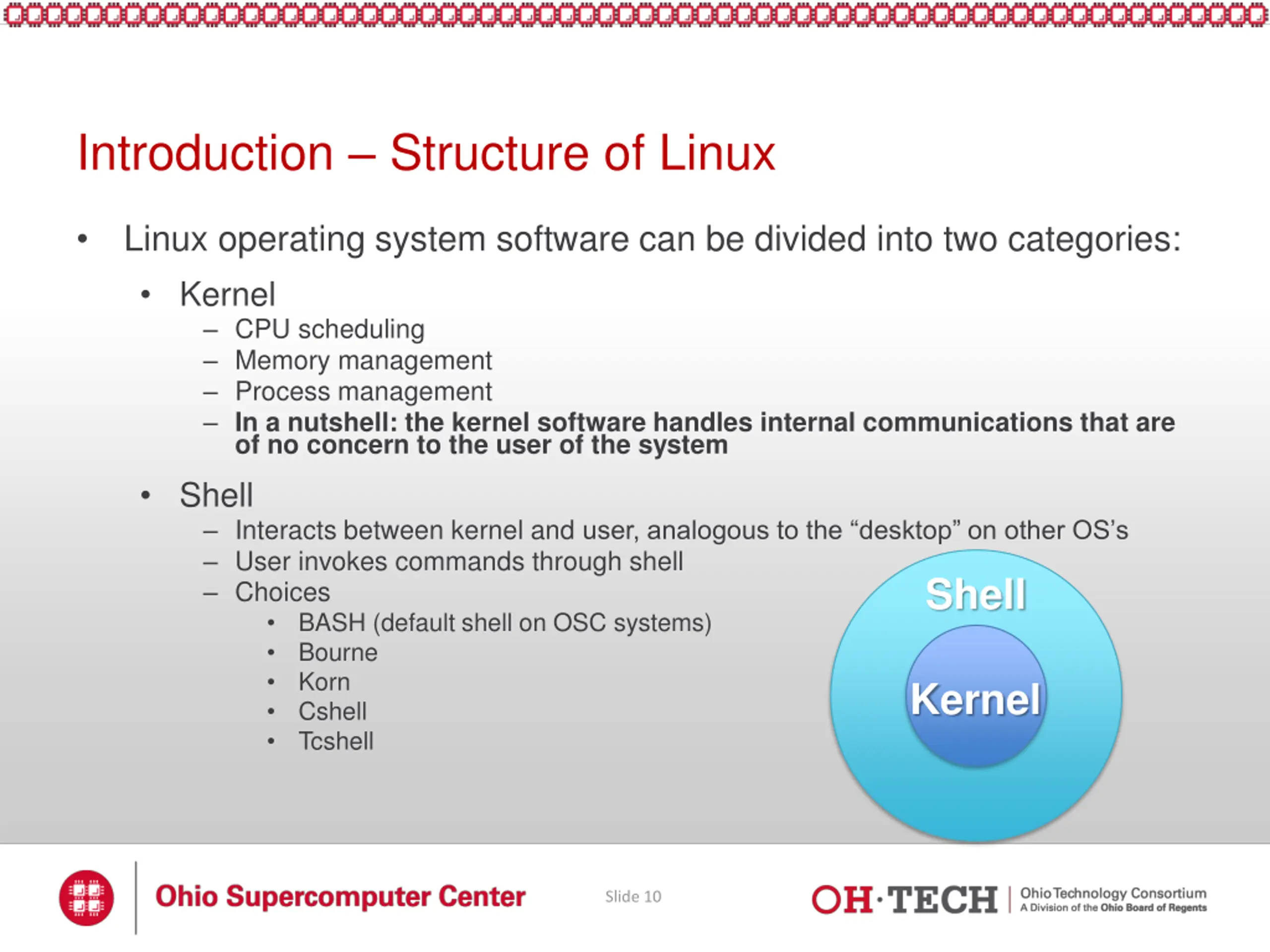 Introduction Structure of Linux Linux operating system software can be divided into two categories: Kernel CPU scheduling Memory management Process management In a nutshell: the kernel software handles internal communications that are of no concern to the user of the system Shell Interacts between kernel and user, analogous to the desktop on other OS s User invokes commands through shell Choices BASH (default shell on OSC systems) Bourne Korn Cshell Tcshell Shell Kernel Slide 10