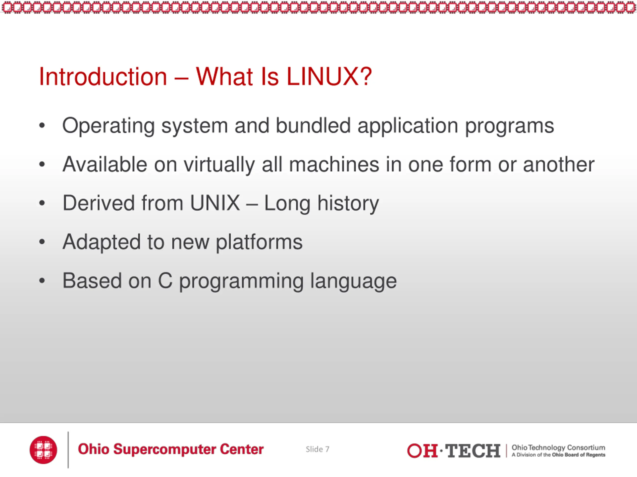 Introduction Learning outcomes of this course Introduce the basics of Linux To learn how to create/modify content in Linux Using Linux text editors to create documents Modifying file/directory permissions To learn how to write and run programs in Linux Provide hands-on practice Slide 6