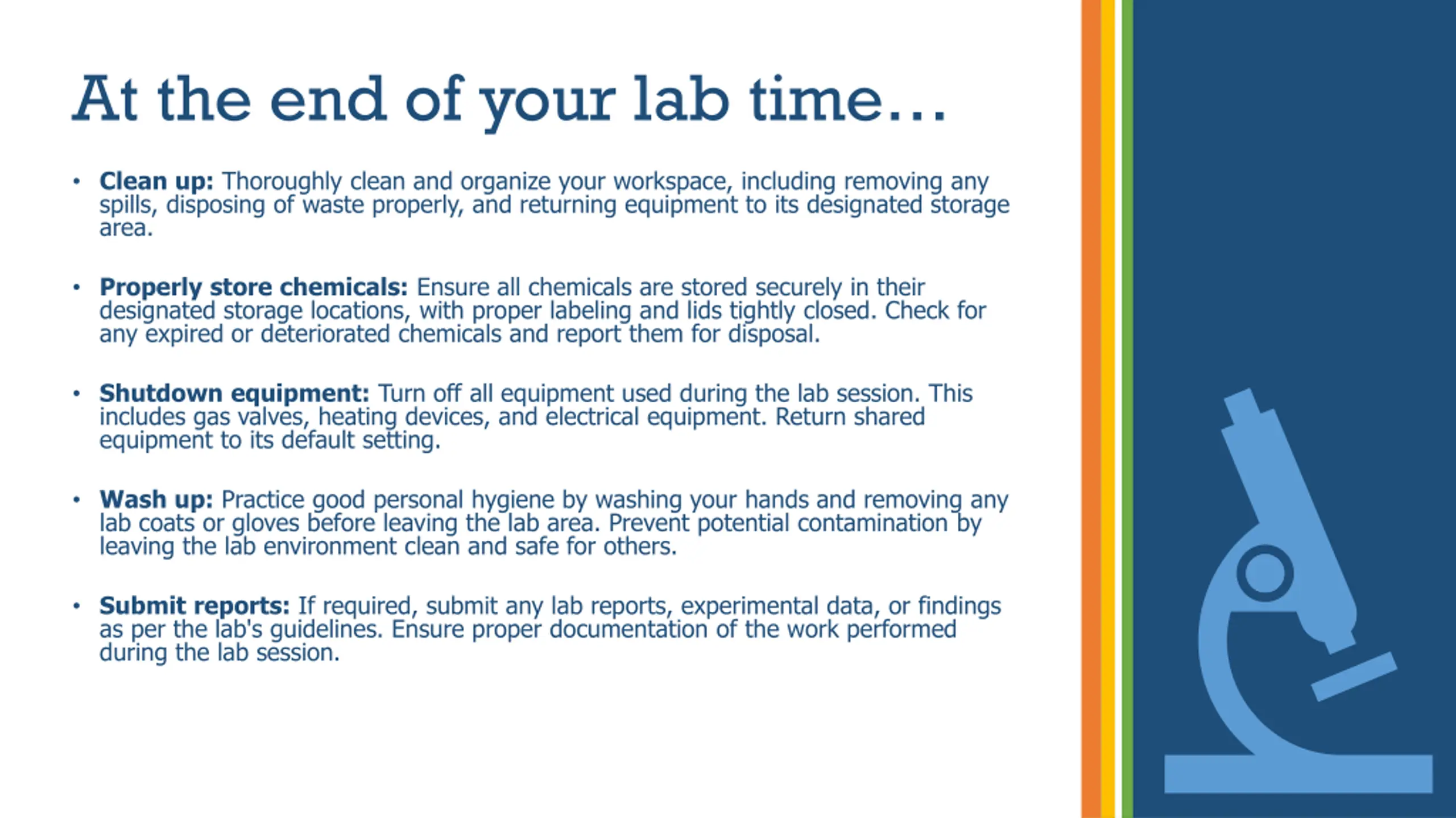 At the end of your lab time Clean up: Thoroughly clean and organize your workspace, including removing any spills, disposing of waste properly, and returning equipment to its designated storage area. Properly store chemicals: Ensure all chemicals are stored securely in their designated storage locations, with proper labeling and lids tightly closed. Check for any expired or deteriorated chemicals and report them for disposal. Shutdown equipment: Turn off all equipment used during the lab session. This includes gas valves, heating devices, and electrical equipment. Return shared equipment to its default setting. Wash up: Practice good personal hygiene by washing your hands and removing any lab coats or gloves before leaving the lab area. Prevent potential contamination by leaving the lab environment clean and safe for others. Submit reports: If required, submit any lab reports, experimental data, or findings as per the lab's guidelines. Ensure proper documentation of the work performed during the lab session.