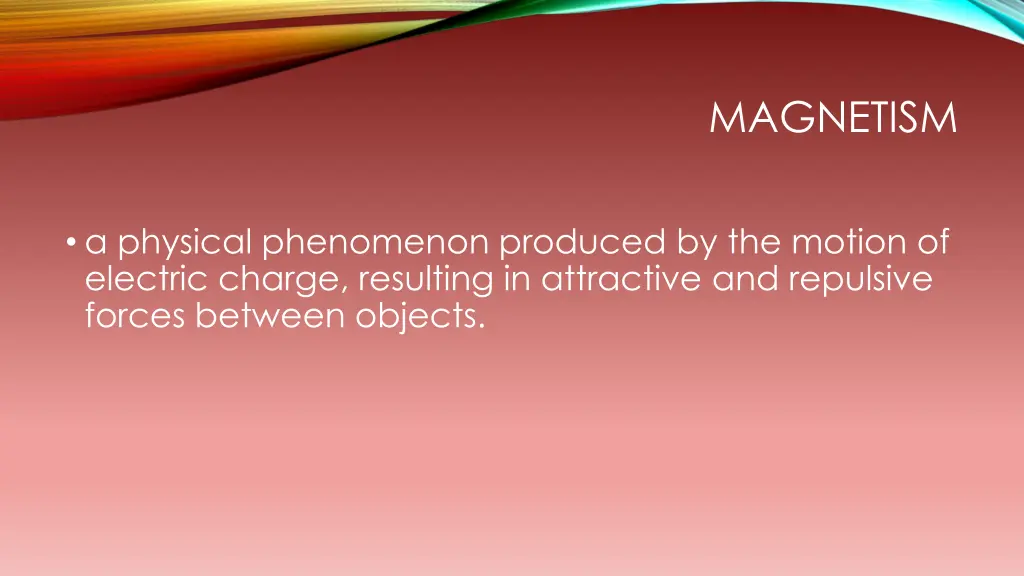 MAGNETISM a physical phenomenon produced by the motion of electric charge, resulting in attractive and repulsive forces between objects.