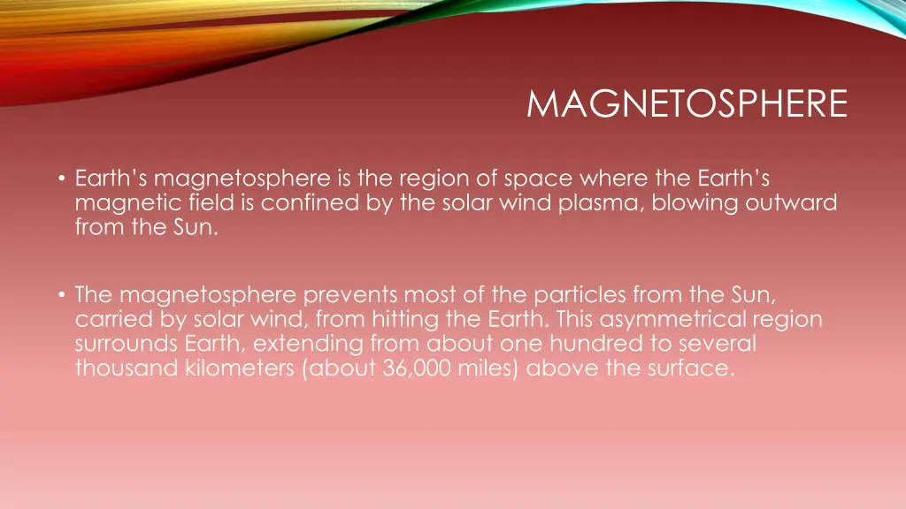MAGNETOSPHERE Earth s magnetosphere is the region of space where the Earth s magnetic field is confined by the solar wind plasma, blowing outward from the Sun. The magnetosphere prevents most of the particles from the Sun, carried by solar wind, from hitting the Earth. This asymmetrical region surrounds Earth, extending from about one hundred to several thousand kilometers (about 36,000 miles) above the surface.