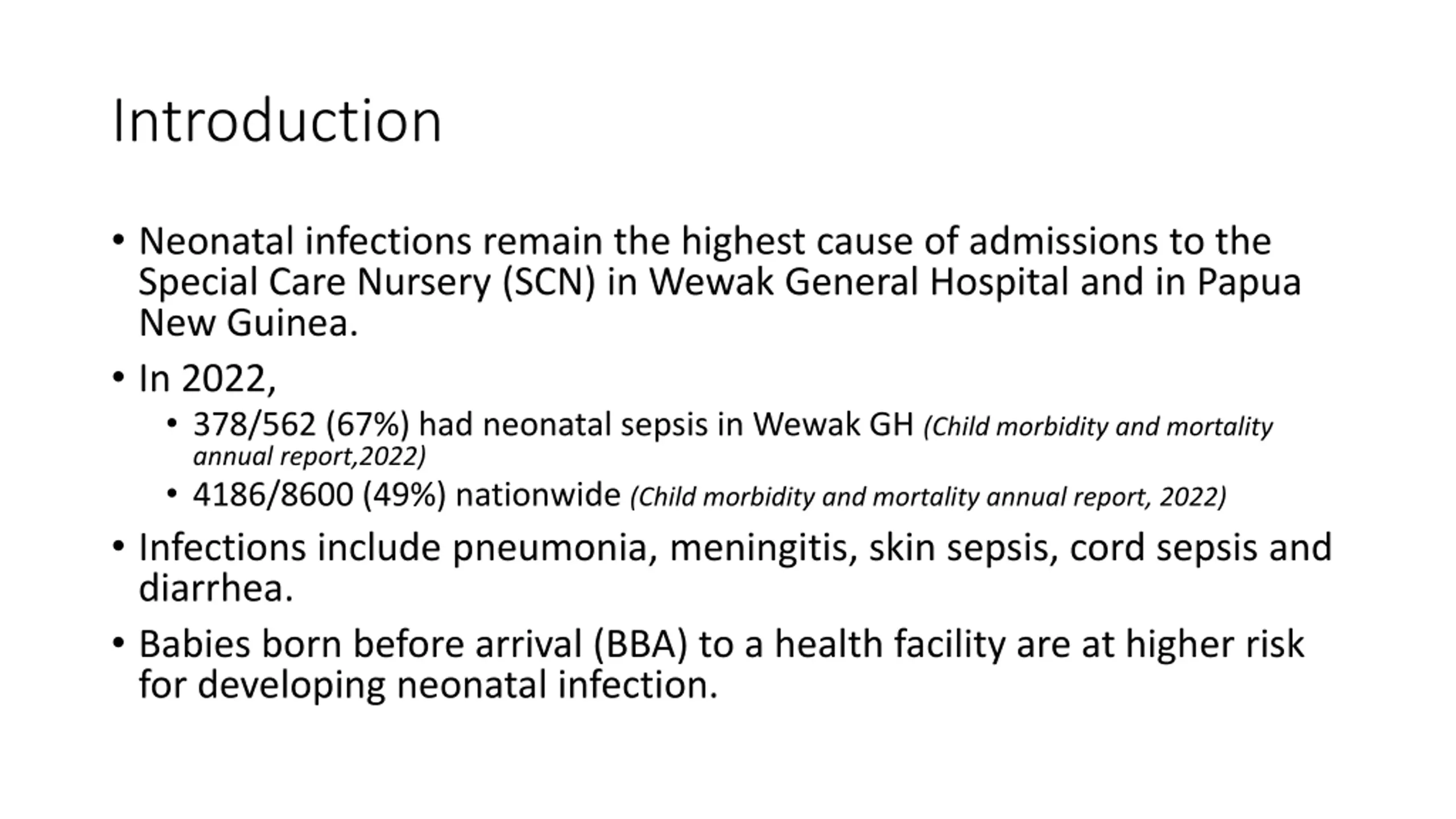 Introduction Neonatal infections remain the highest cause of admissions to the Special Care Nursery (SCN) in Wewak General Hospital and in Papua New Guinea. In 2022, 378/562 (67%) had neonatal sepsis in Wewak GH (Child morbidity and mortality annual report,2022) 4186/8600 (49%) nationwide (Child morbidity and mortality annual report, 2022) Infections include pneumonia, meningitis, skin sepsis, cord sepsis and diarrhea. Babies born before arrival (BBA) to a health facility are at higher risk for developing neonatal infection.
