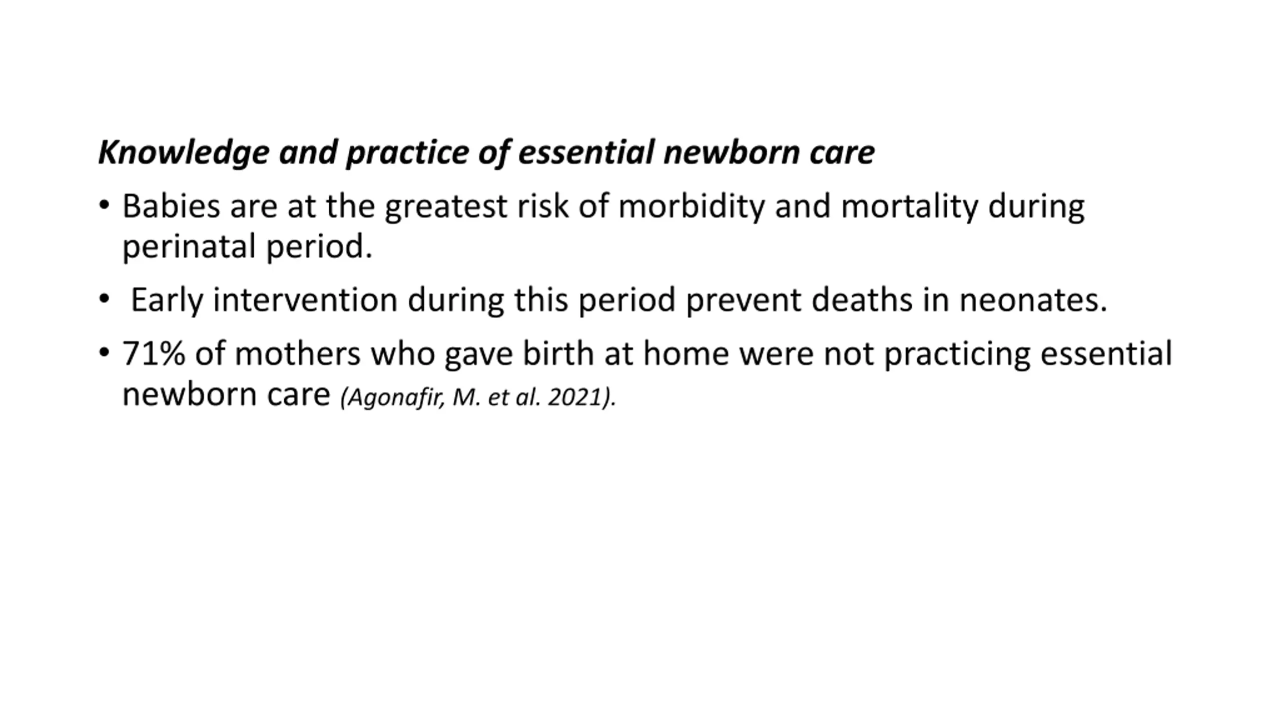 Knowledge and practice of essential newborn care Babies are at the greatest risk of morbidity and mortality during perinatal period. Early intervention during this period prevent deaths in neonates. 71% of mothers who gave birth at home were not practicing essential newborn care (Agonafir, M. et al. 2021).