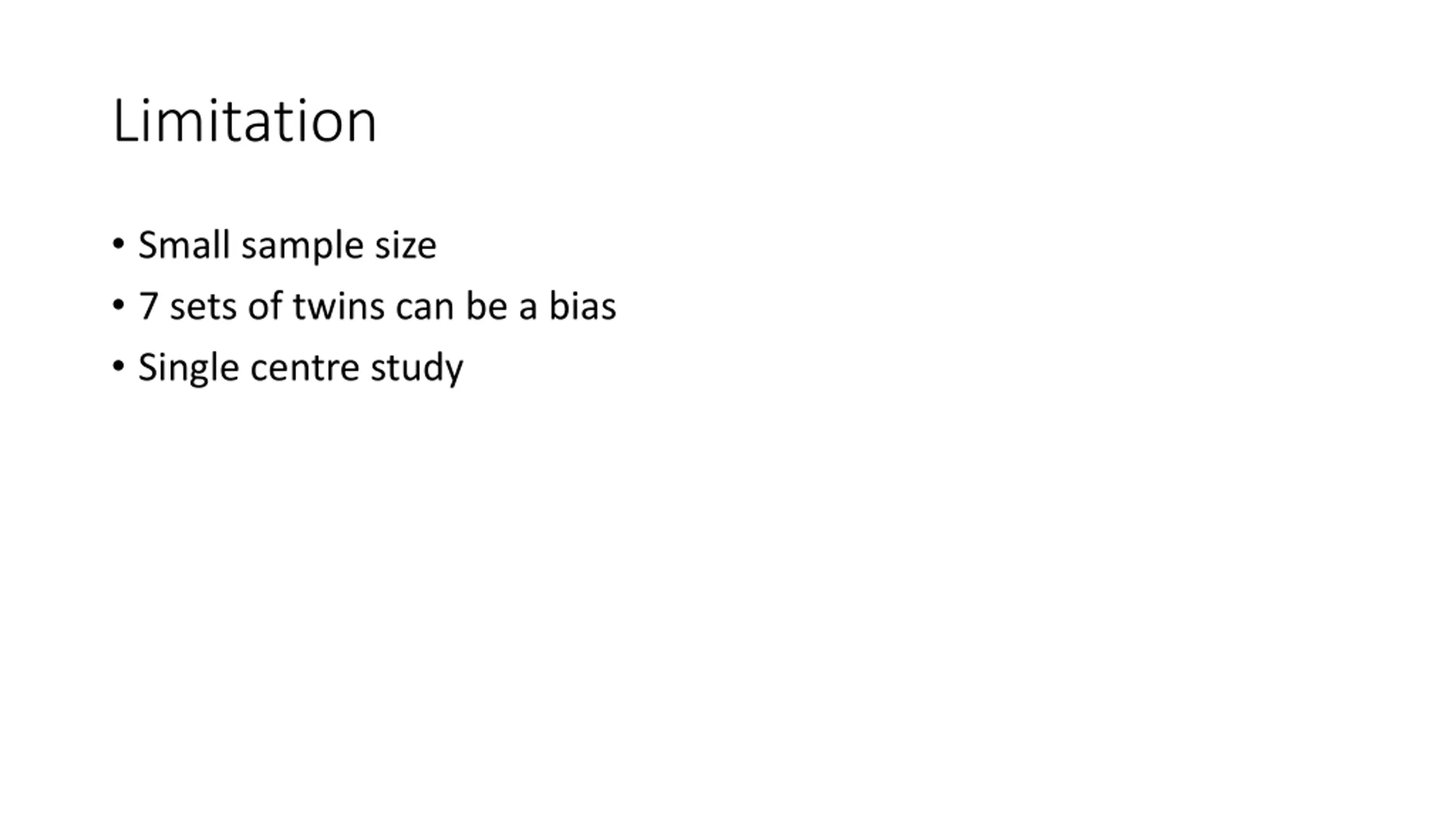 Limitation Small sample size 7 sets of twins can be a bias Single centre study