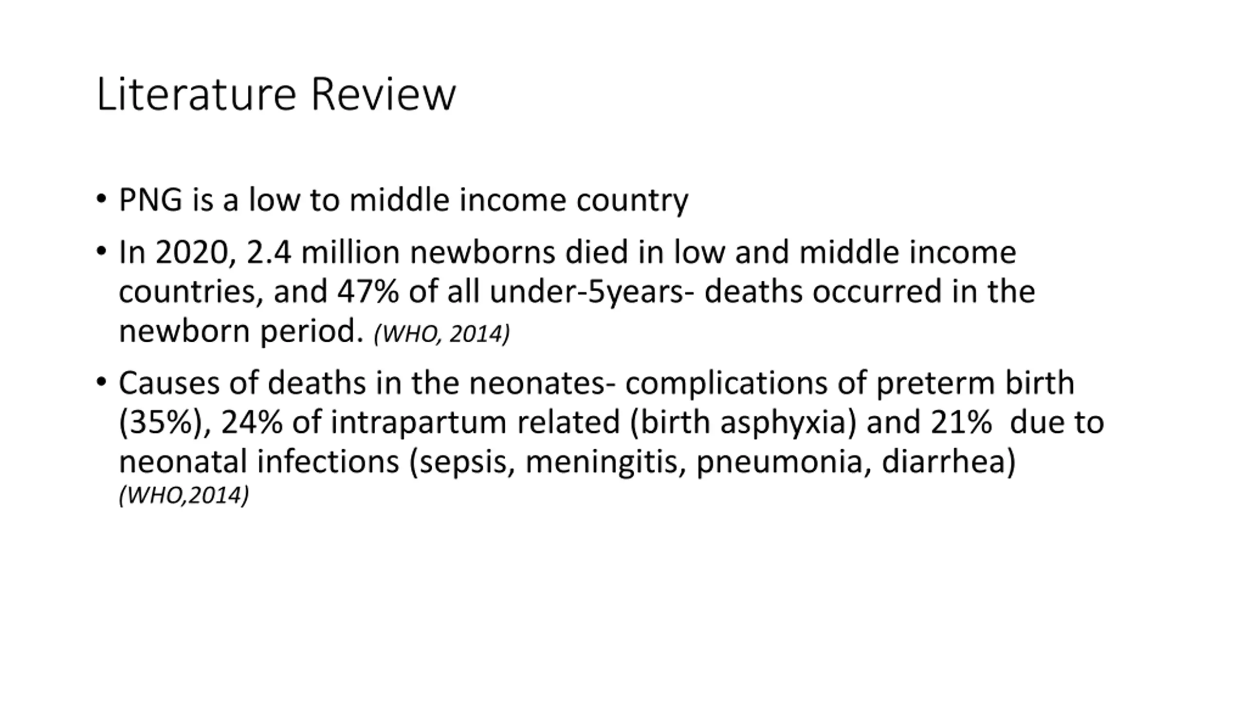 Literature Review PNG is a low to middle income country In 2020, 2.4 million newborns died in low and middle income countries, and 47% of all under-5years- deaths occurred in the newborn period. (WHO, 2014) Causes of deaths in the neonates- complications of preterm birth (35%), 24% of intrapartum related (birth asphyxia) and 21% due to neonatal infections (sepsis, meningitis, pneumonia, diarrhea) (WHO,2014)