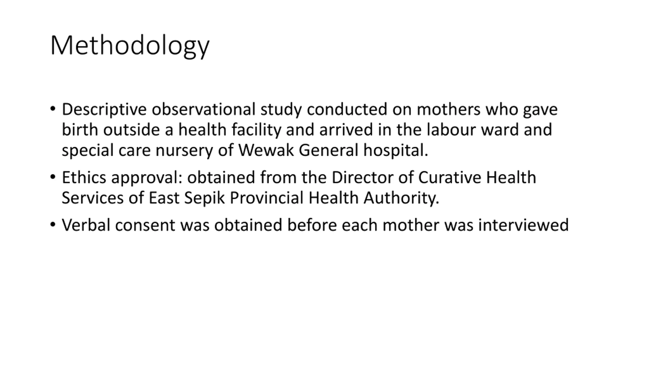 Methodology Descriptive observational study conducted on mothers who gave birth outside a health facility and arrived in the labour ward and special care nursery of Wewak General hospital. Ethics approval: obtained from the Director of Curative Health Services of East Sepik Provincial Health Authority. Verbal consent was obtained before each mother was interviewed