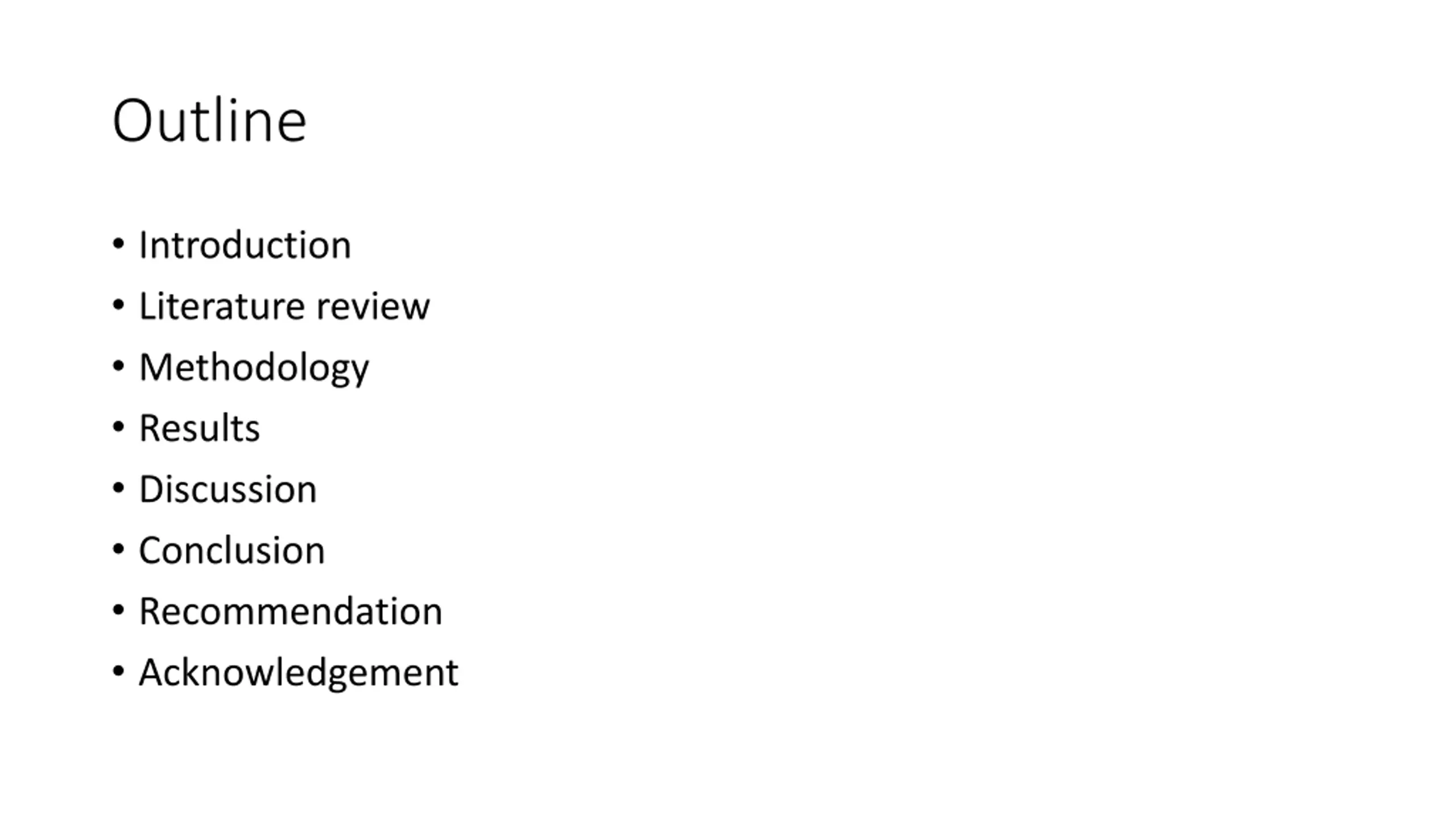 Outline Introduction Literature review Methodology Results Discussion Conclusion Recommendation Acknowledgement