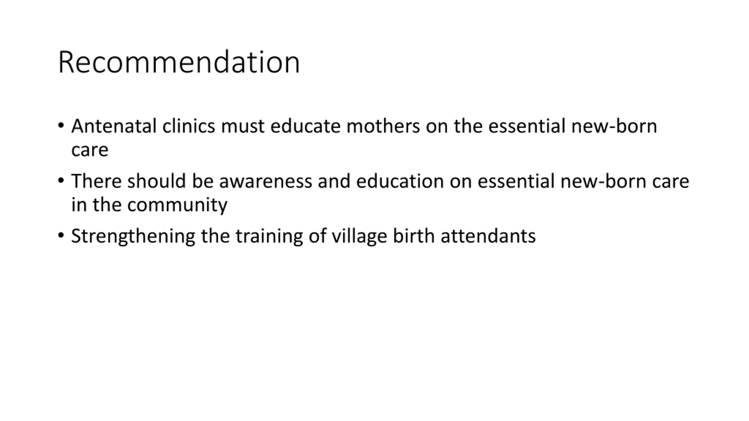 Recommendation Antenatal clinics must educate mothers on the essential new-born care There should be awareness and education on essential new-born care in the community Strengthening the training of village birth attendants