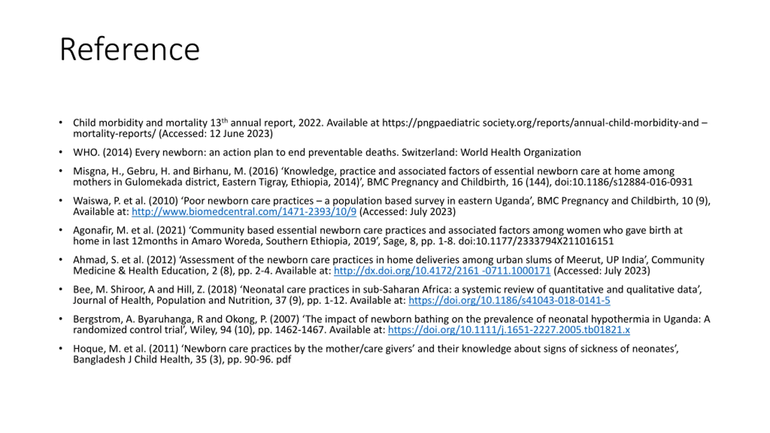 Reference Child morbidity and mortality 13thannual report, 2022. Available at https://pngpaediatric society.org/reports/annual-child-morbidity-and mortality-reports/ (Accessed: 12 June 2023) WHO. (2014) Every newborn: an action plan to end preventable deaths. Switzerland: World Health Organization Misgna, H., Gebru, H. and Birhanu, M. (2016) Knowledge, practice and associated factors of essential newborn care at home among mothers in Gulomekada district, Eastern Tigray, Ethiopia, 2014) , BMC Pregnancy and Childbirth, 16 (144), doi:10.1186/s12884-016-0931 Waiswa, P. et al. (2010) Poor newborn care practices a population based survey in eastern Uganda , BMC Pregnancy and Childbirth, 10 (9), Available at: http://www.biomedcentral.com/1471-2393/10/9 (Accessed: July 2023) Agonafir, M. et al. (2021) Community based essential newborn care practices and associated factors among women who gave birth at home in last 12months in Amaro Woreda, Southern Ethiopia, 2019 , Sage, 8, pp. 1-8. doi:10.1177/2333794X211016151 Ahmad, S. et al. (2012) Assessment of the newborn care practices in home deliveries among urban slums of Meerut, UP India , Community Medicine & Health Education, 2 (8), pp. 2-4. Available at: http://dx.doi.org/10.4172/2161 -0711.1000171 (Accessed: July 2023) Bee, M. Shiroor, A and Hill, Z. (2018) Neonatal care practices in sub-Saharan Africa: a systemic review of quantitative and qualitative data , Journal of Health, Population and Nutrition, 37 (9), pp. 1-12. Available at: https://doi.org/10.1186/s41043-018-0141-5 Bergstrom, A. Byaruhanga, R and Okong, P. (2007) The impact of newborn bathing on the prevalence of neonatal hypothermia in Uganda: A randomized control trial , Wiley, 94 (10), pp. 1462-1467. Available at: https://doi.org/10.1111/j.1651-2227.2005.tb01821.x Hoque, M. et al. (2011) Newborn care practices by the mother/care givers and their knowledge about signs of sickness of neonates , Bangladesh J Child Health, 35 (3), pp. 90-96. pdf