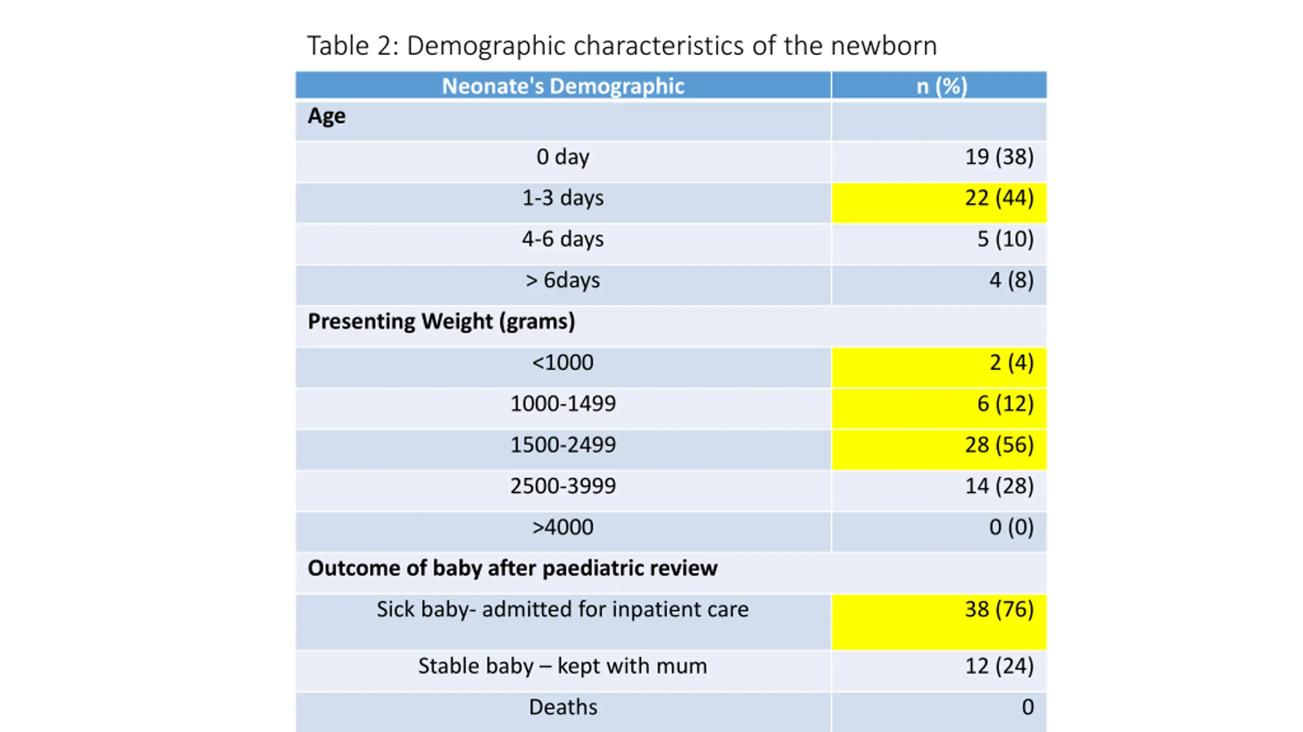 Table 2: Demographic characteristics of the newborn Neonate's Demographic n (%) Age 0 day 19 (38) 1-3 days 22 (44) 4-6 days 5 (10) > 6days 4 (8) Presenting Weight (grams) <1000 2 (4) 1000-1499 6 (12) 1500-2499 28 (56) 2500-3999 14 (28) >4000 0 (0) Outcome of baby after paediatric review Sick baby- admitted for inpatient care 38 (76) Stable baby kept with mum 12 (24) Deaths 0