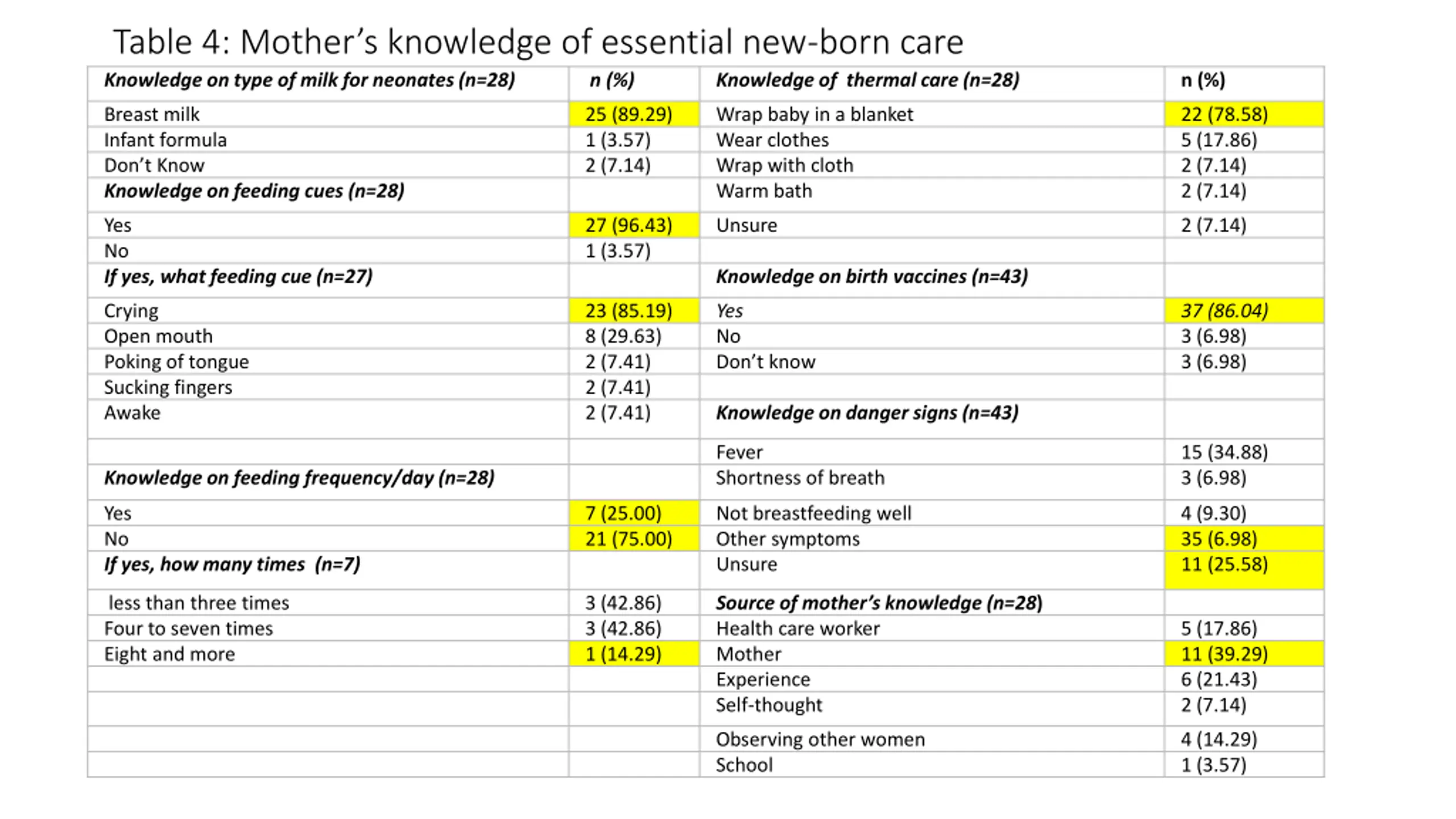 This study describes mothers knowledge and practice of: cord care breastfeeding thermal care immunization (birth vaccines) recognizing danger signs that a newborn may have.