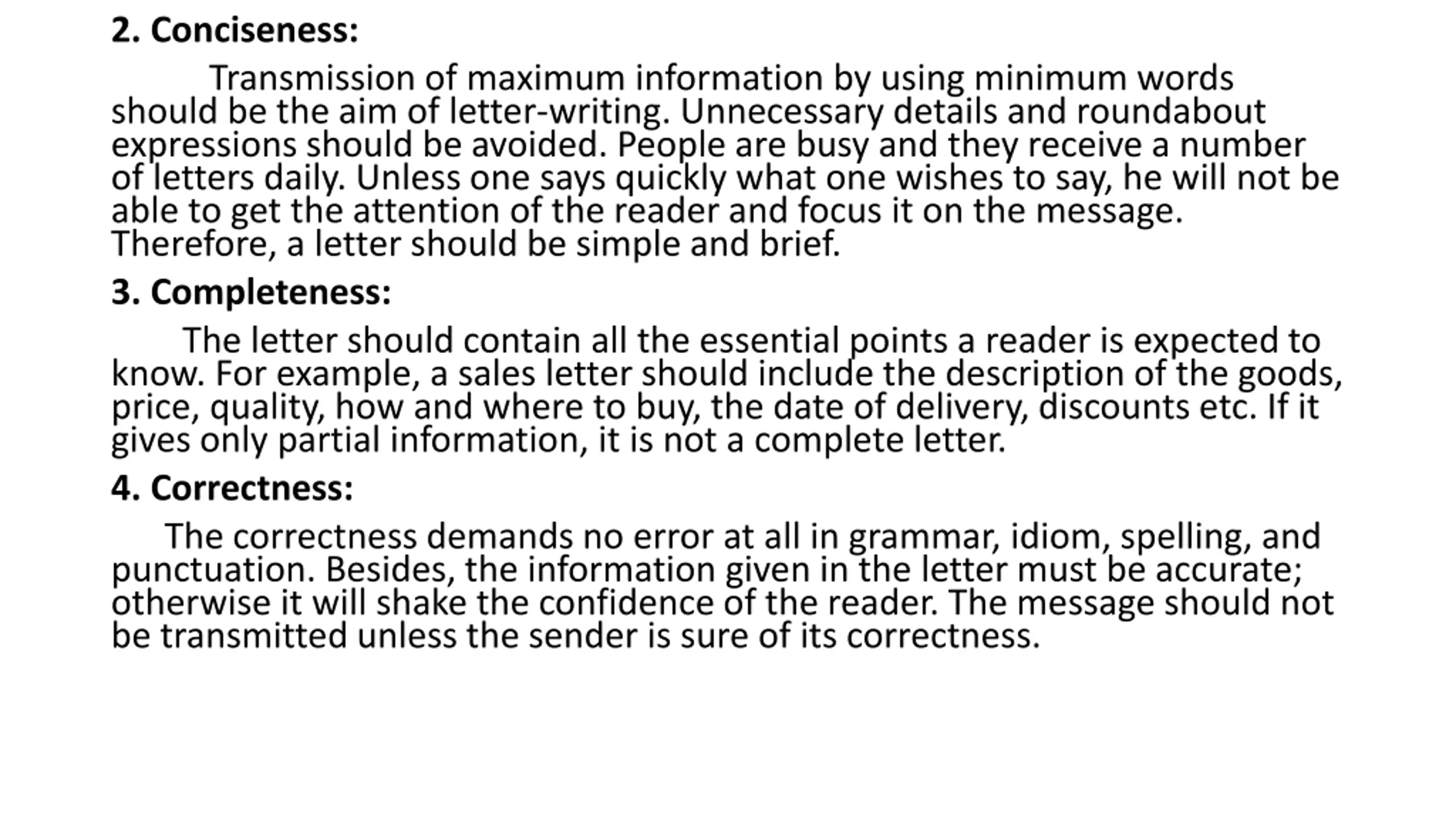 2. Conciseness: Transmission of maximum information by using minimum words should be the aim of letter-writing. Unnecessary details and roundabout expressions should be avoided. People are busy and they receive a number of letters daily. Unless one says quickly what one wishes to say, he will not be able to get the attention of the reader and focus it on the message. Therefore, a letter should be simple and brief. 3. Completeness: The letter should contain all the essential points a reader is expected to know. For example, a sales letter should include the description of the goods, price, quality, how and where to buy, the date of delivery, discounts etc. If it gives only partial information, it is not a complete letter. 4. Correctness: The correctness demands no error at all in grammar, idiom, spelling, and punctuation. Besides, the information given in the letter must be accurate; otherwise it will shake the confidence of the reader. The message should not be transmitted unless the sender is sure of its correctness.