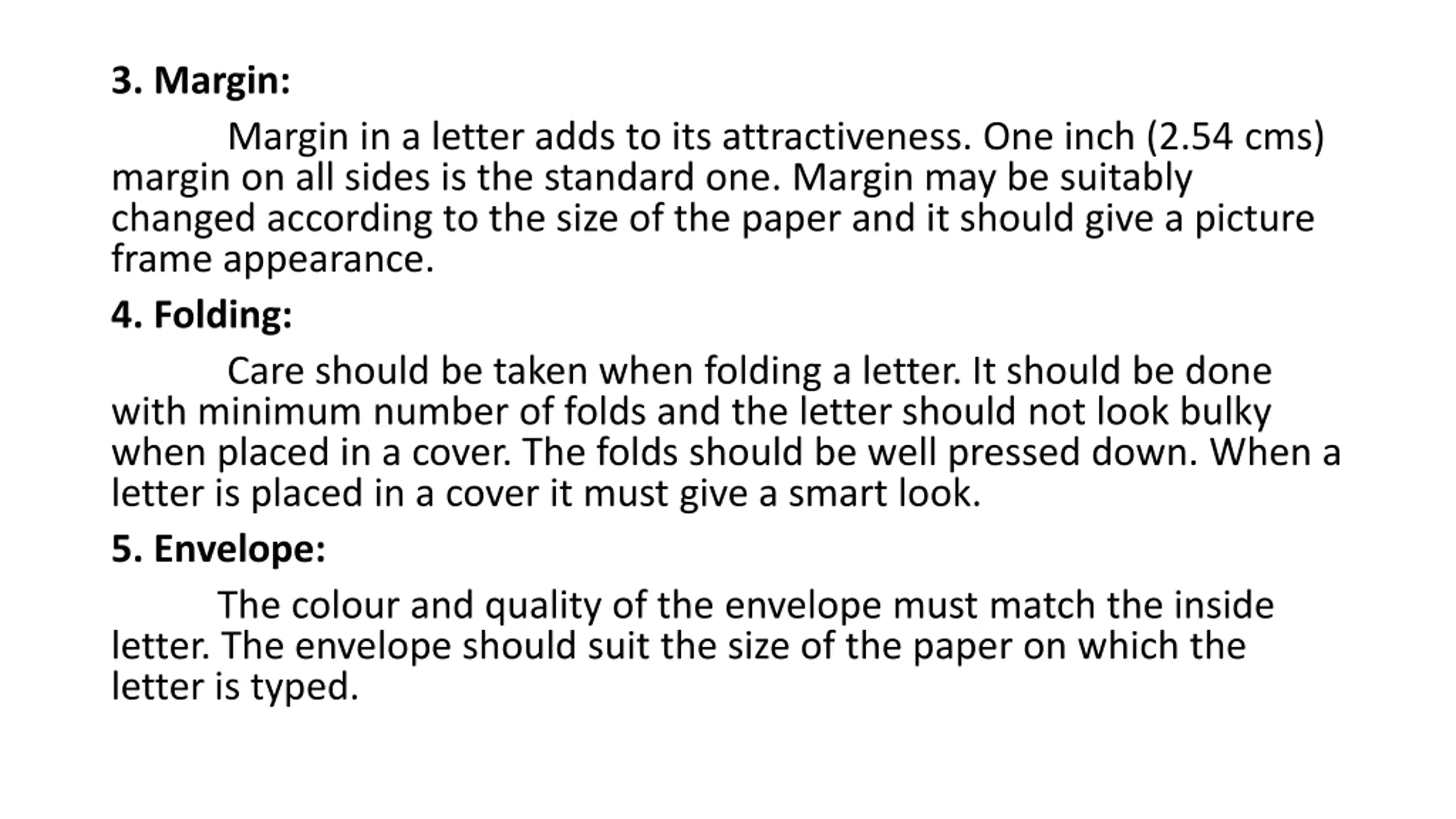 3. Margin: Margin in a letter adds to its attractiveness. One inch (2.54 cms) margin on all sides is the standard one. Margin may be suitably changed according to the size of the paper and it should give a picture frame appearance. 4. Folding: Care should be taken when folding a letter. It should be done with minimum number of folds and the letter should not look bulky when placed in a cover. The folds should be well pressed down. When a letter is placed in a cover it must give a smart look. 5. Envelope: The colour and quality of the envelope must match the inside letter. The envelope should suit the size of the paper on which the letter is typed.