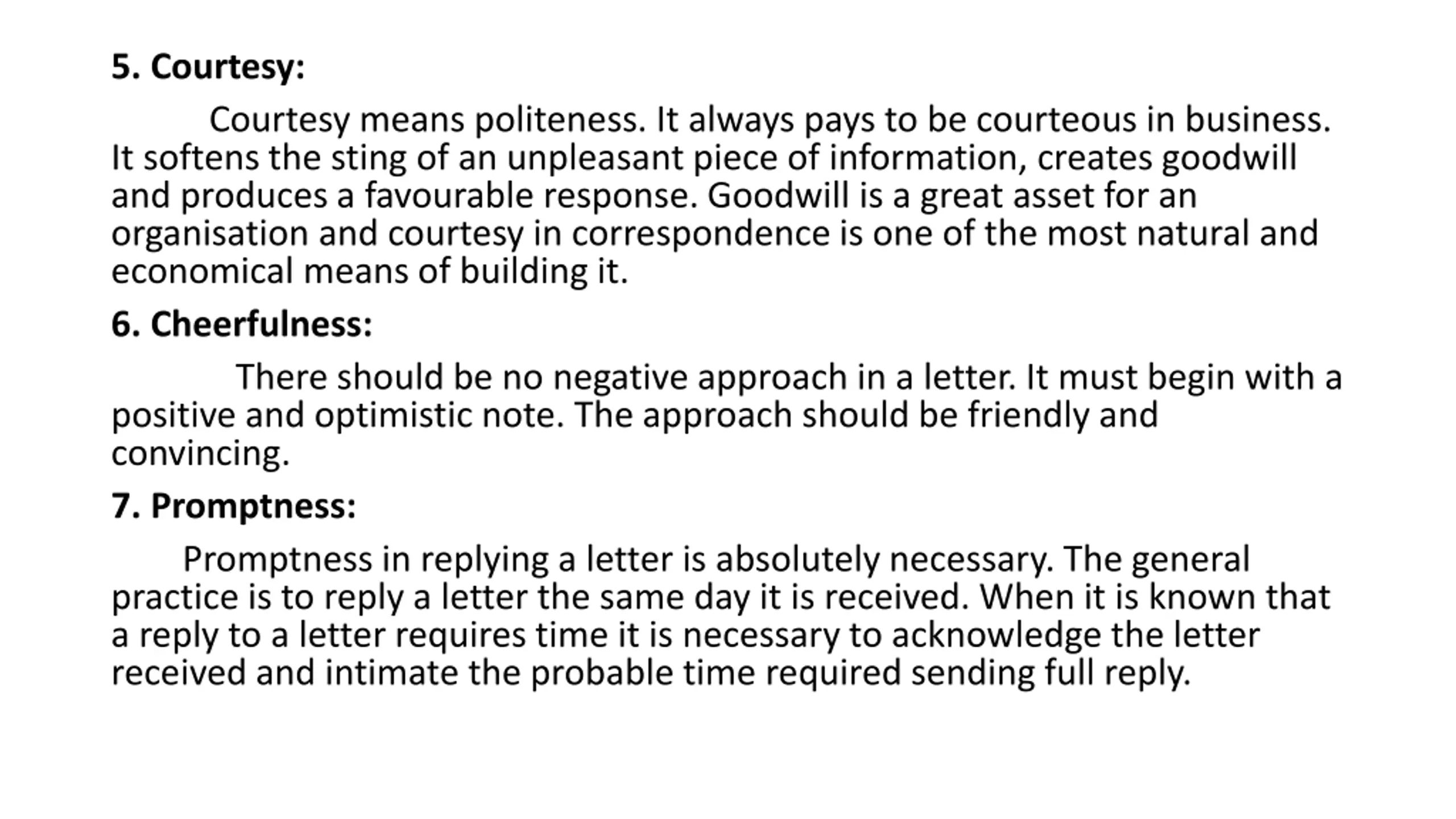 5. Courtesy: Courtesy means politeness. It always pays to be courteous in business. It softens the sting of an unpleasant piece of information, creates goodwill and produces a favourable response. Goodwill is a great asset for an organisation and courtesy in correspondence is one of the most natural and economical means of building it. 6. Cheerfulness: There should be no negative approach in a letter. It must begin with a positive and optimistic note. The approach should be friendly and convincing. 7. Promptness: Promptness in replying a letter is absolutely necessary. The general practice is to reply a letter the same day it is received. When it is known that a reply to a letter requires time it is necessary to acknowledge the letter received and intimate the probable time required sending full reply.
