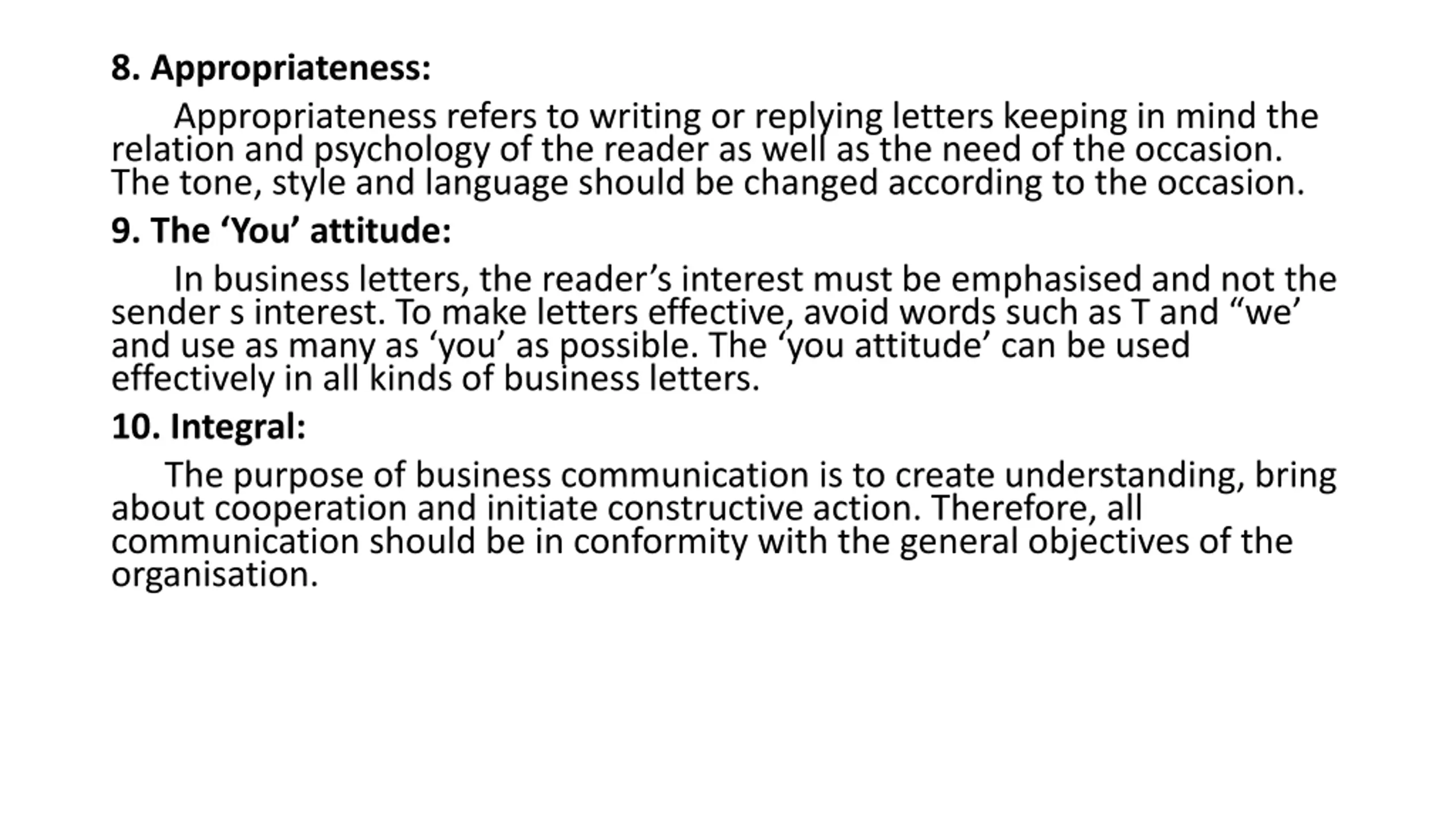 8. Appropriateness: Appropriateness refers to writing or replying letters keeping in mind the relation and psychology of the reader as well as the need of the occasion. The tone, style and language should be changed according to the occasion. 9. The You attitude: In business letters, the reader s interest must be emphasised and not the sender s interest. To make letters effective, avoid words such as T and we and use as many as you as possible. The you attitude can be used effectively in all kinds of business letters. 10. Integral: The purpose of business communication is to create understanding, bring about cooperation and initiate constructive action. Therefore, all communication should be in conformity with the general objectives of the organisation.