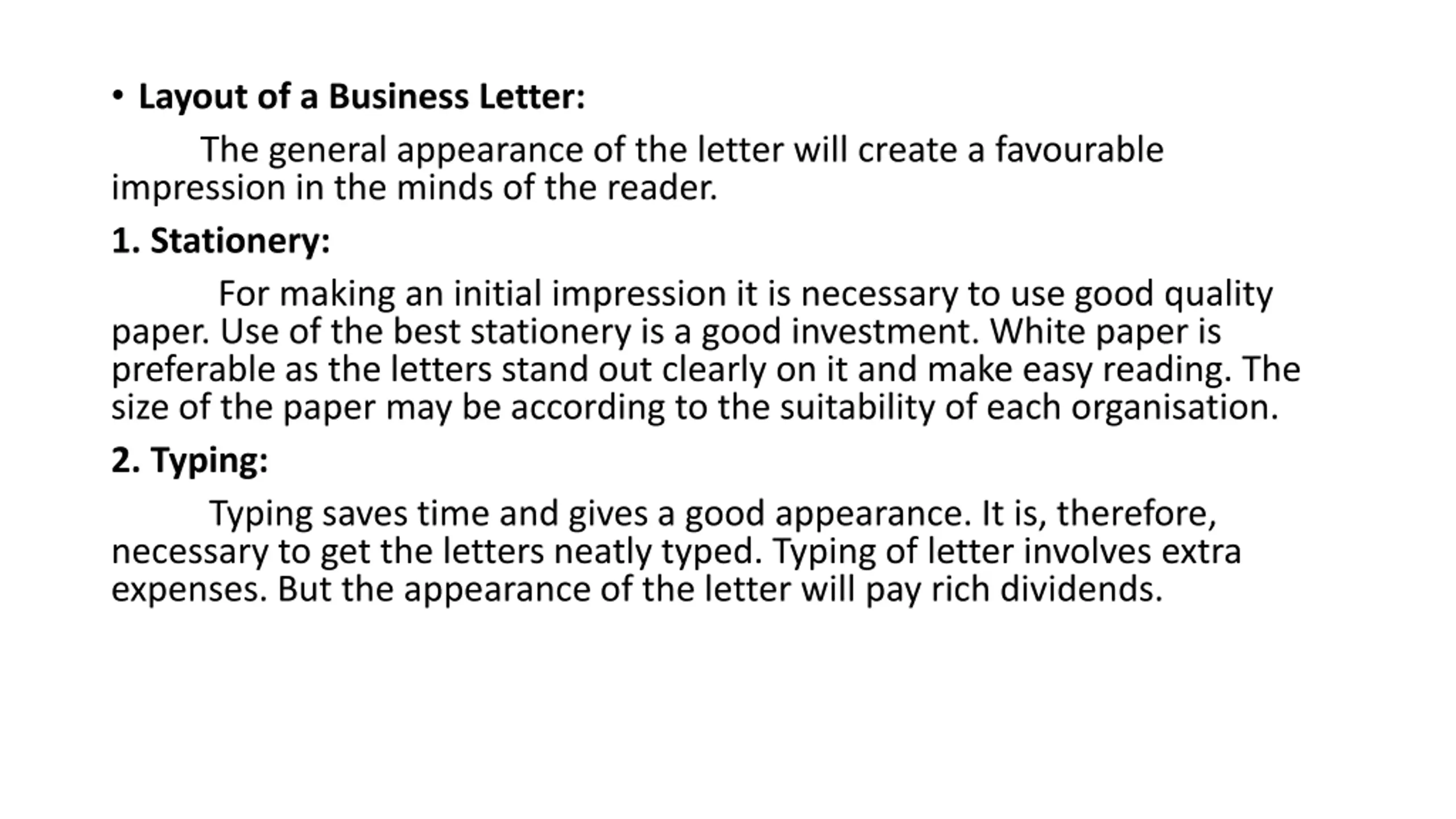 Layout of a Business Letter: The general appearance of the letter will create a favourable impression in the minds of the reader. 1. Stationery: For making an initial impression it is necessary to use good quality paper. Use of the best stationery is a good investment. White paper is preferable as the letters stand out clearly on it and make easy reading. The size of the paper may be according to the suitability of each organisation. 2. Typing: Typing saves time and gives a good appearance. It is, therefore, necessary to get the letters neatly typed. Typing of letter involves extra expenses. But the appearance of the letter will pay rich dividends.