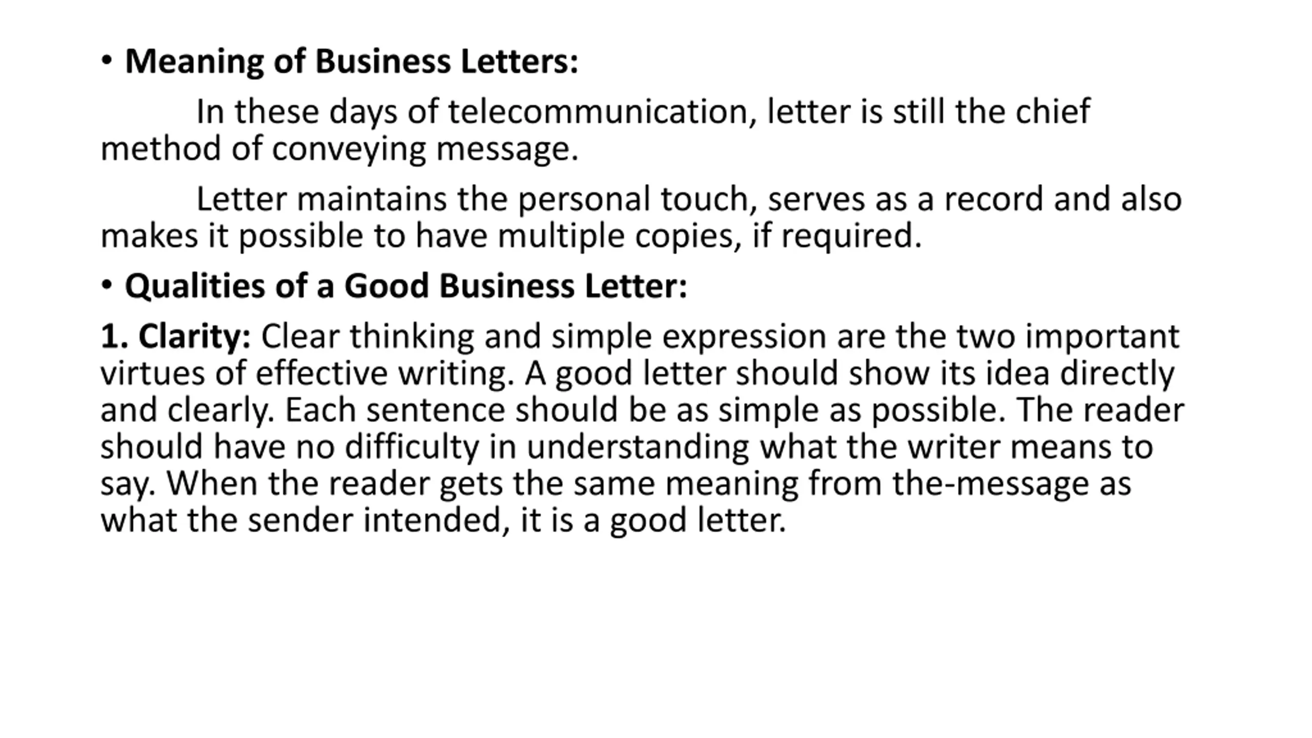 Meaning of Business Letters: In these days of telecommunication, letter is still the chief method of conveying message. Letter maintains the personal touch, serves as a record and also makes it possible to have multiple copies, if required. Qualities of a Good Business Letter: 1. Clarity: Clear thinking and simple expression are the two important virtues of effective writing. A good letter should show its idea directly and clearly. Each sentence should be as simple as possible. The reader should have no difficulty in understanding what the writer means to say. When the reader gets the same meaning from the-message as what the sender intended, it is a good letter.