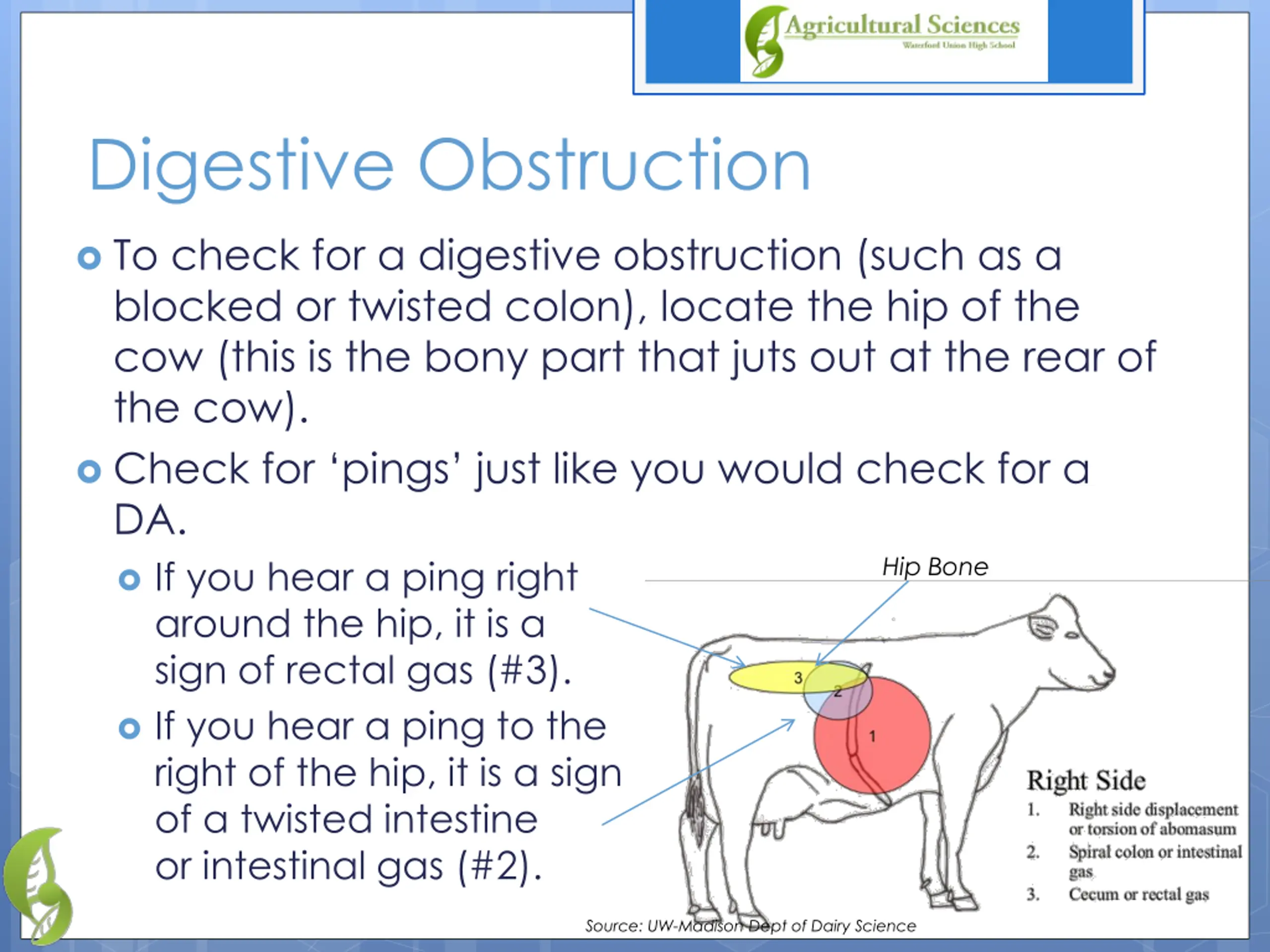 Digestive Obstruction To check for a digestive obstruction (such as a blocked or twisted colon), locate the hip of the cow (this is the bony part that juts out at the rear of the cow). Check for pings just like you would check for a DA. If you hear a ping right around the hip, it is a sign of rectal gas (#3). If you hear a ping to the right of the hip, it is a sign of a twisted intestine or intestinal gas (#2). Hip Bone Source: UW-Madison Dept of Dairy Science