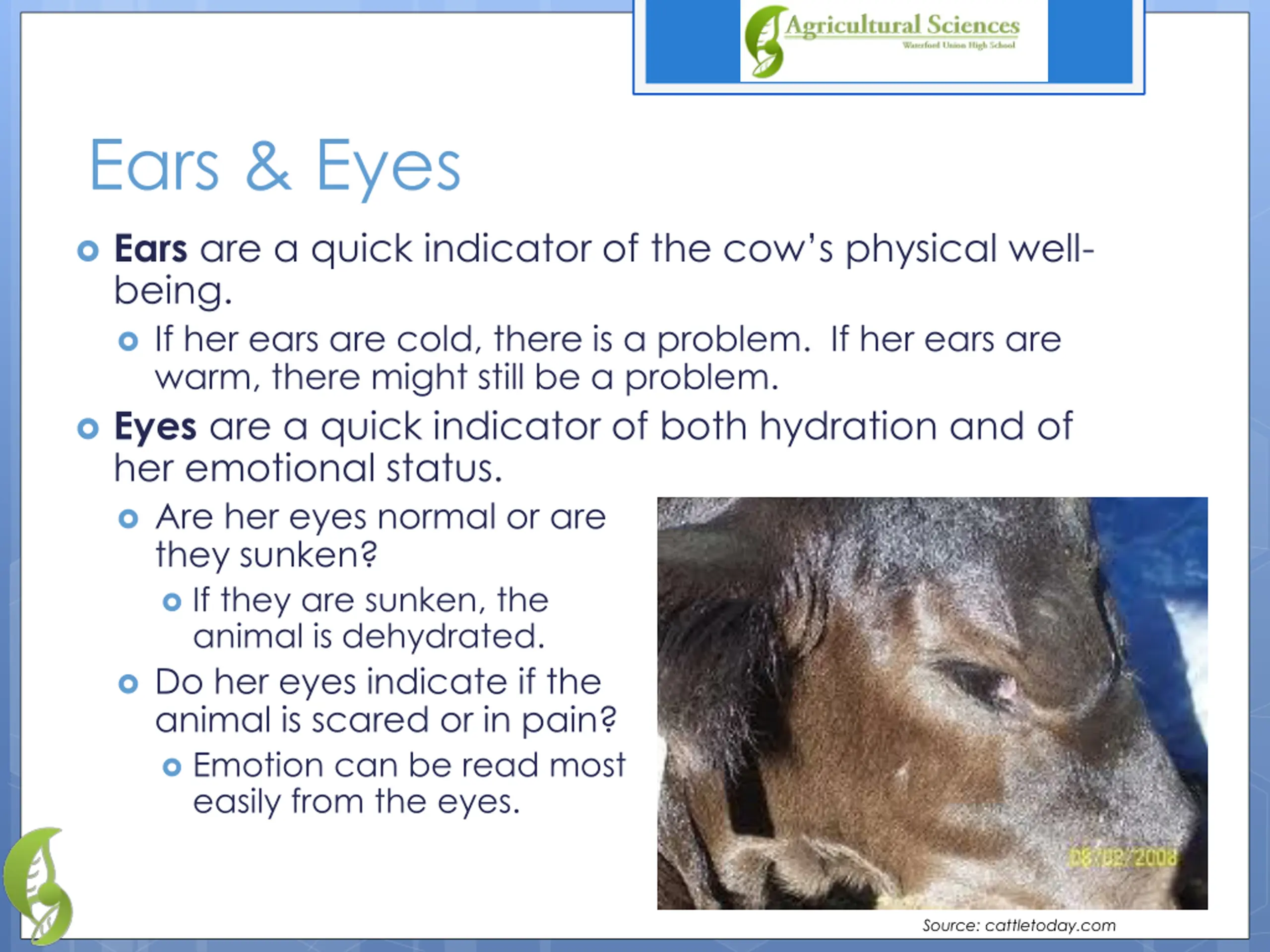 Ears & Eyes Earsare a quick indicator of the cow s physical well- being. If her ears are cold, there is a problem. If her ears are warm, there might still be a problem. Eyes are a quick indicator of both hydration and of her emotional status. Are her eyes normal or are they sunken? If they are sunken, the animal is dehydrated. Do her eyes indicate if the animal is scared or in pain? Emotion can be read most easily from the eyes. Source: cattletoday.com