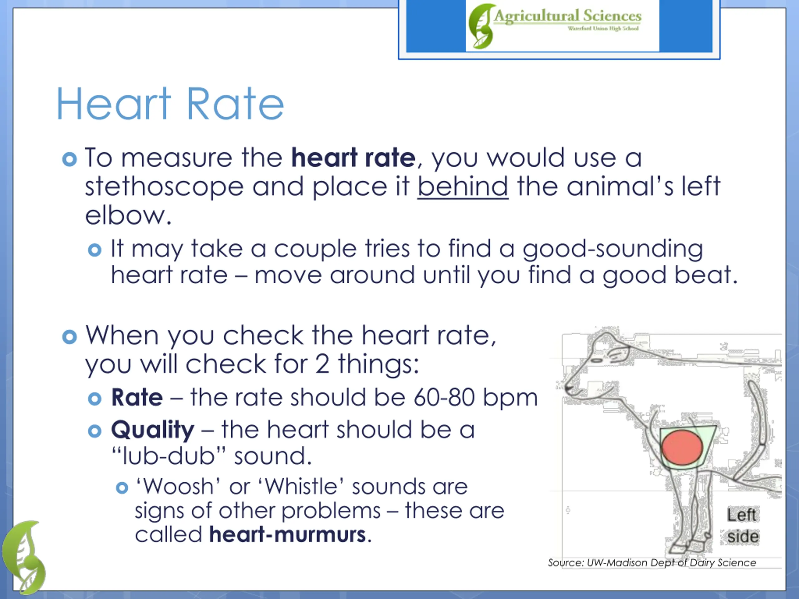 Heart Rate To measure the heart rate, you would use a stethoscope and place it behind the animal s left elbow. It may take a couple tries to find a good-sounding heart rate move around until you find a good beat. When you check the heart rate, you will check for 2 things: Rate the rate should be 60-80 bpm Quality the heart should be a lub-dub sound. Woosh or Whistle sounds are signs of other problems these are called heart-murmurs. Source: UW-Madison Dept of Dairy Science
