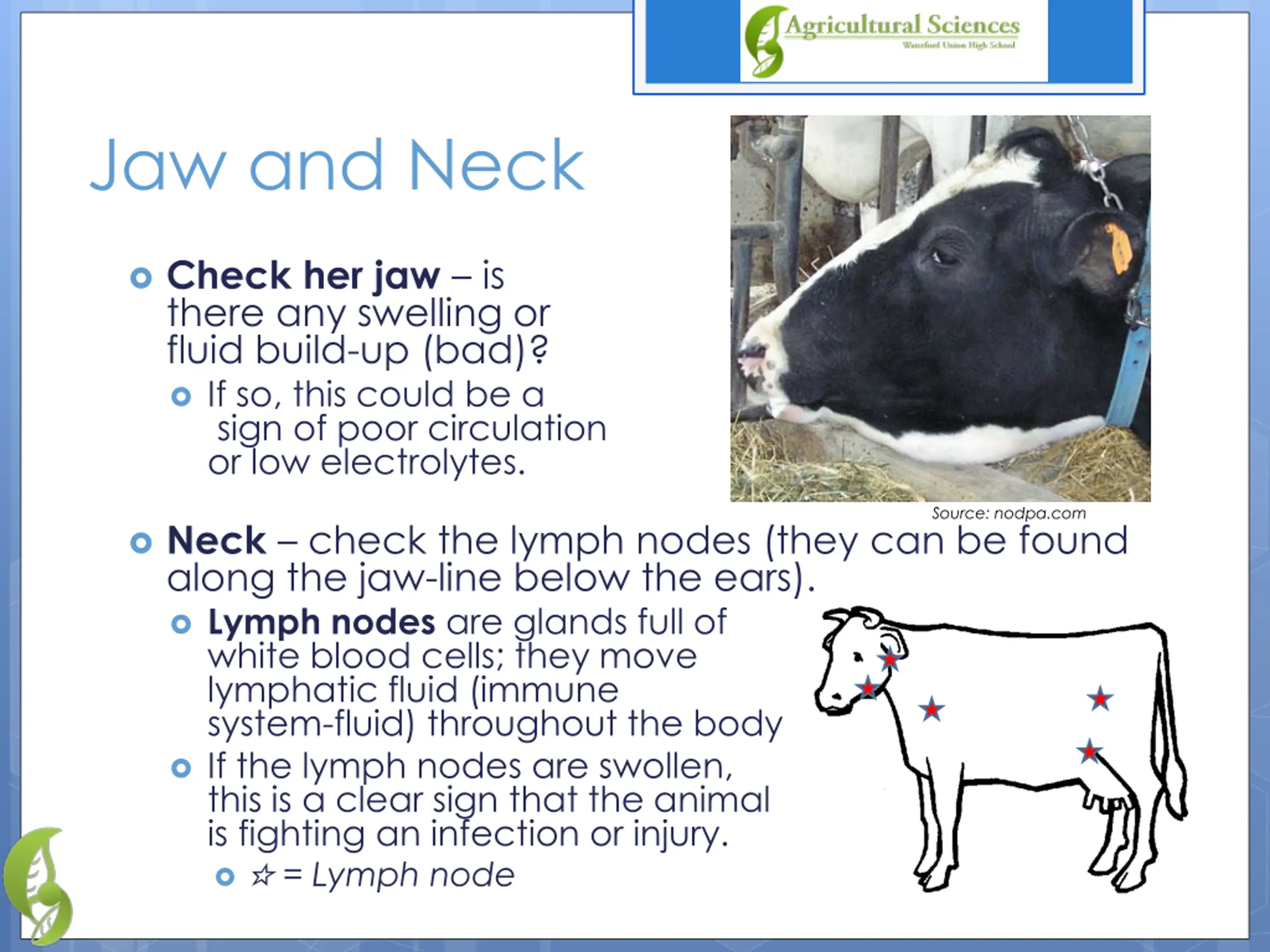 Jaw and Neck Check her jaw is there any swelling or fluid build-up (bad)? If so, this could be a sign of poor circulation or low electrolytes. Source: nodpa.com Neck check the lymph nodes (they can be found along the jaw-line below the ears). Lymph nodes are glands full of white blood cells; they move lymphatic fluid (immune system-fluid) throughout the body If the lymph nodes are swollen, this is a clear sign that the animal is fighting an infection or injury. = Lymph node