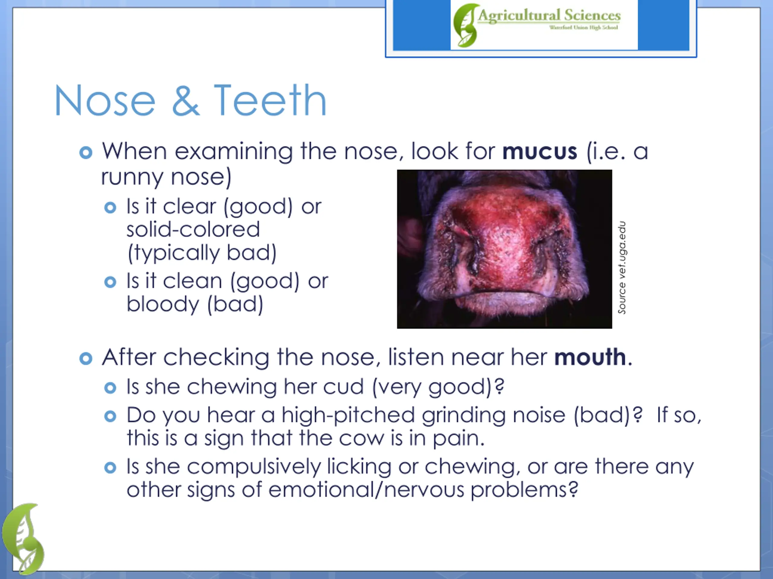 Nose & Teeth When examining the nose, look for mucus (i.e. a runny nose) Is it clear (good) or solid-colored (typically bad) Is it clean (good) or bloody (bad) Source vet.uga.edu After checking the nose, listen near her mouth. Is she chewing her cud (very good)? Do you hear a high-pitched grinding noise (bad)? If so, this is a sign that the cow is in pain. Is she compulsively licking or chewing, or are there any other signs of emotional/nervous problems?