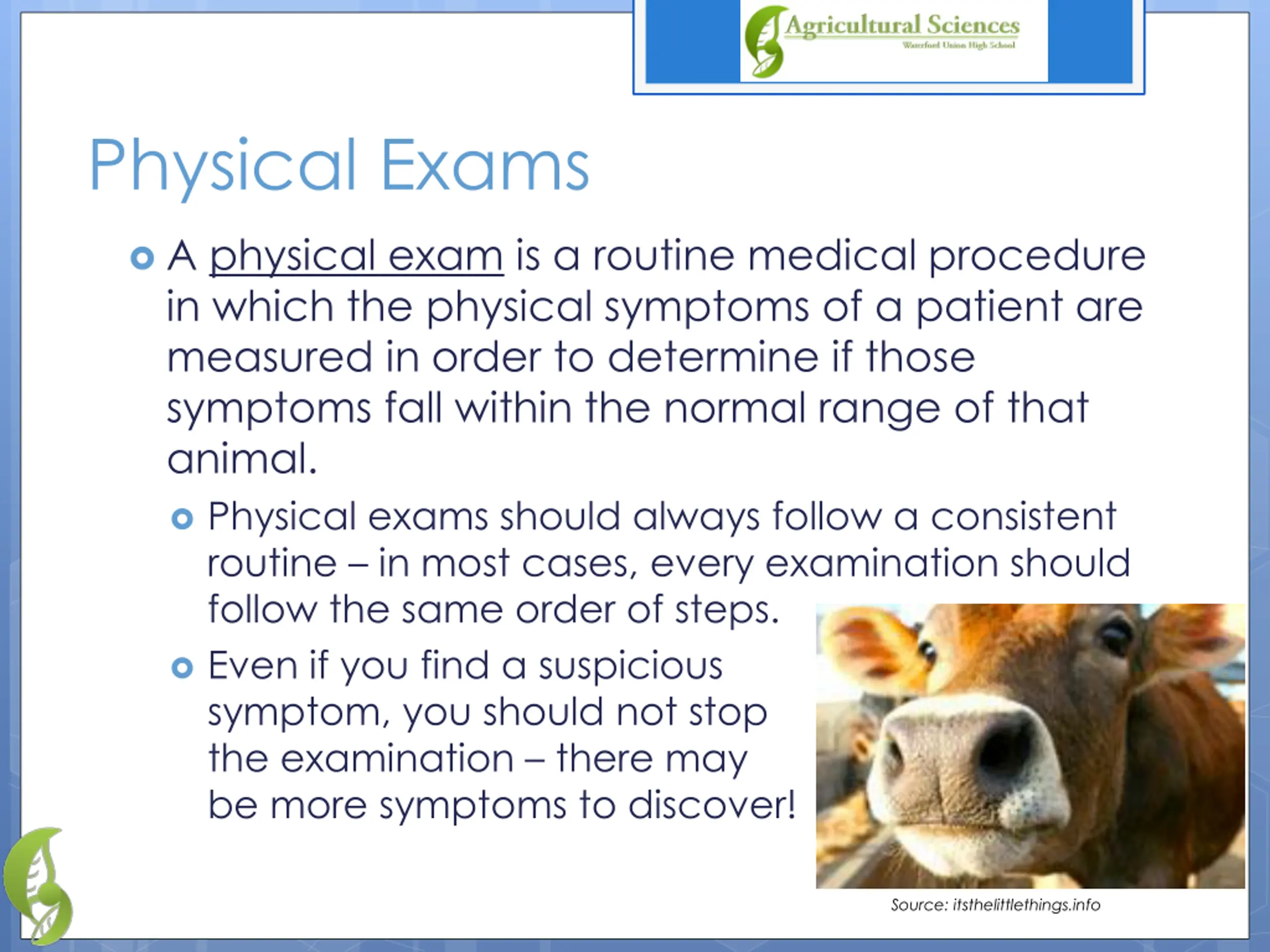 Physical Exams A physical exam is a routine medical procedure in which the physical symptoms of a patient are measured in order to determine if those symptoms fall within the normal range of that animal. Physical exams should always follow a consistent routine in most cases, every examination should follow the same order of steps. Even if you find a suspicious symptom, you should not stop the examination there may be more symptoms to discover! Source: itsthelittlethings.info