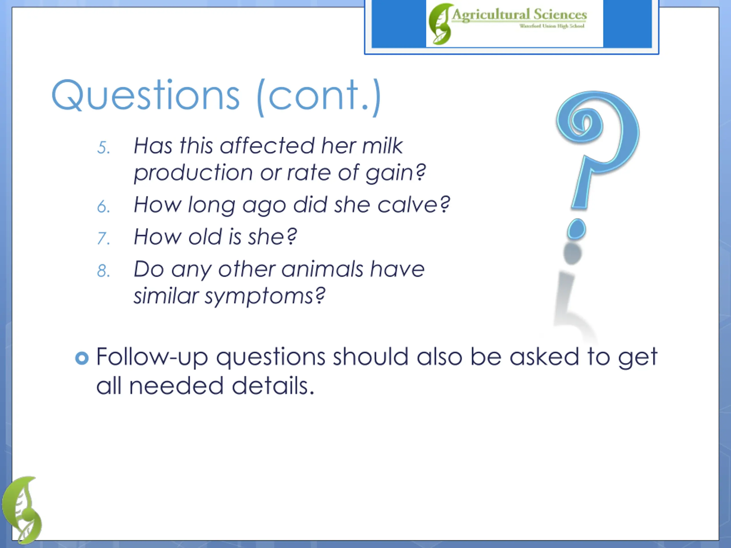 Questions (cont.) Has this affected her milk production or rate of gain? How long ago did she calve? How old is she? Do any other animals have similar symptoms? 5. 6. 7. 8. Follow-up questions should also be asked to get all needed details.