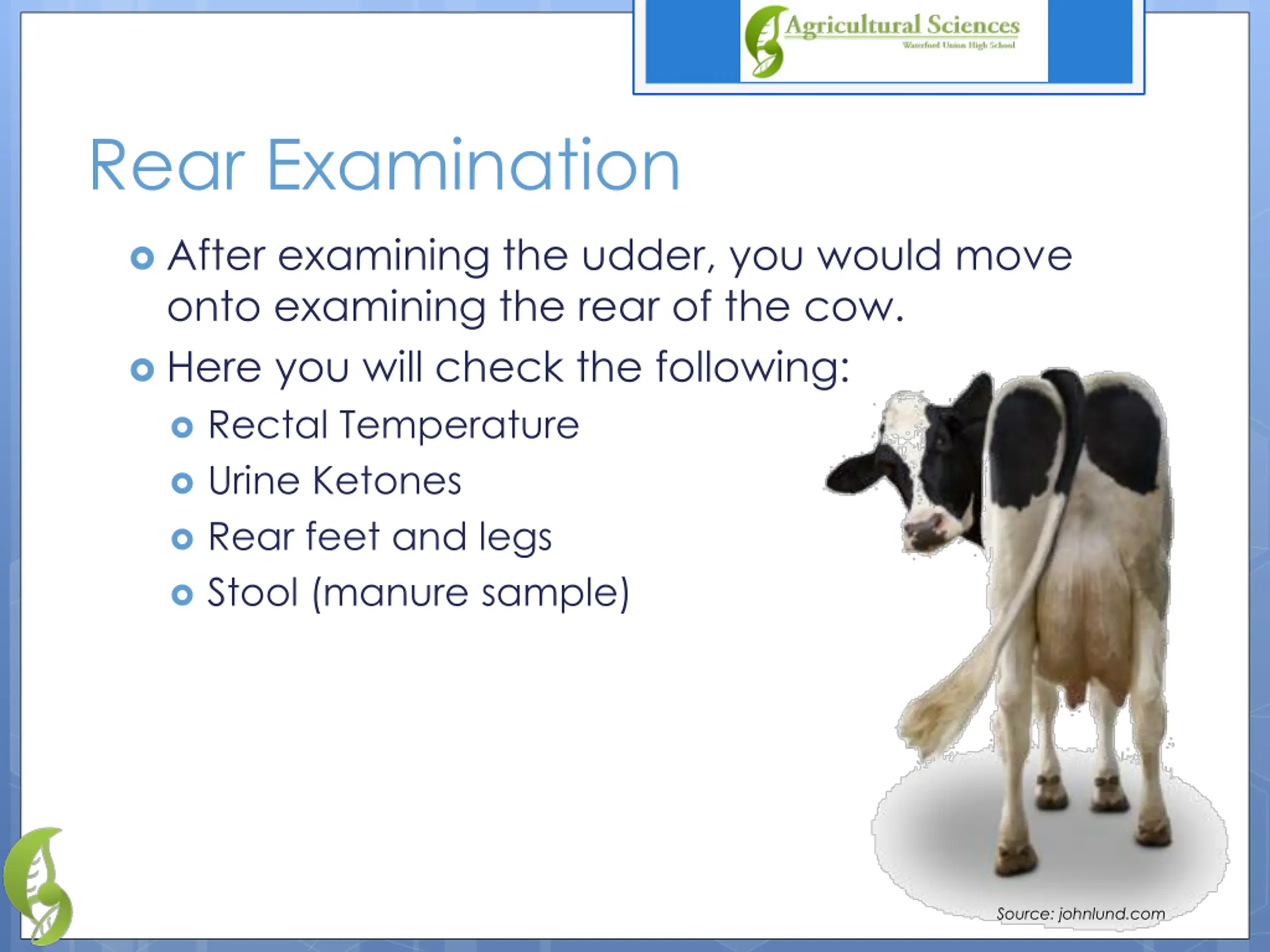 Rear Examination After examining the udder, you would move onto examining the rear of the cow. Here you will check the following: Rectal Temperature Urine Ketones Rear feet and legs Stool (manure sample) Source: johnlund.com