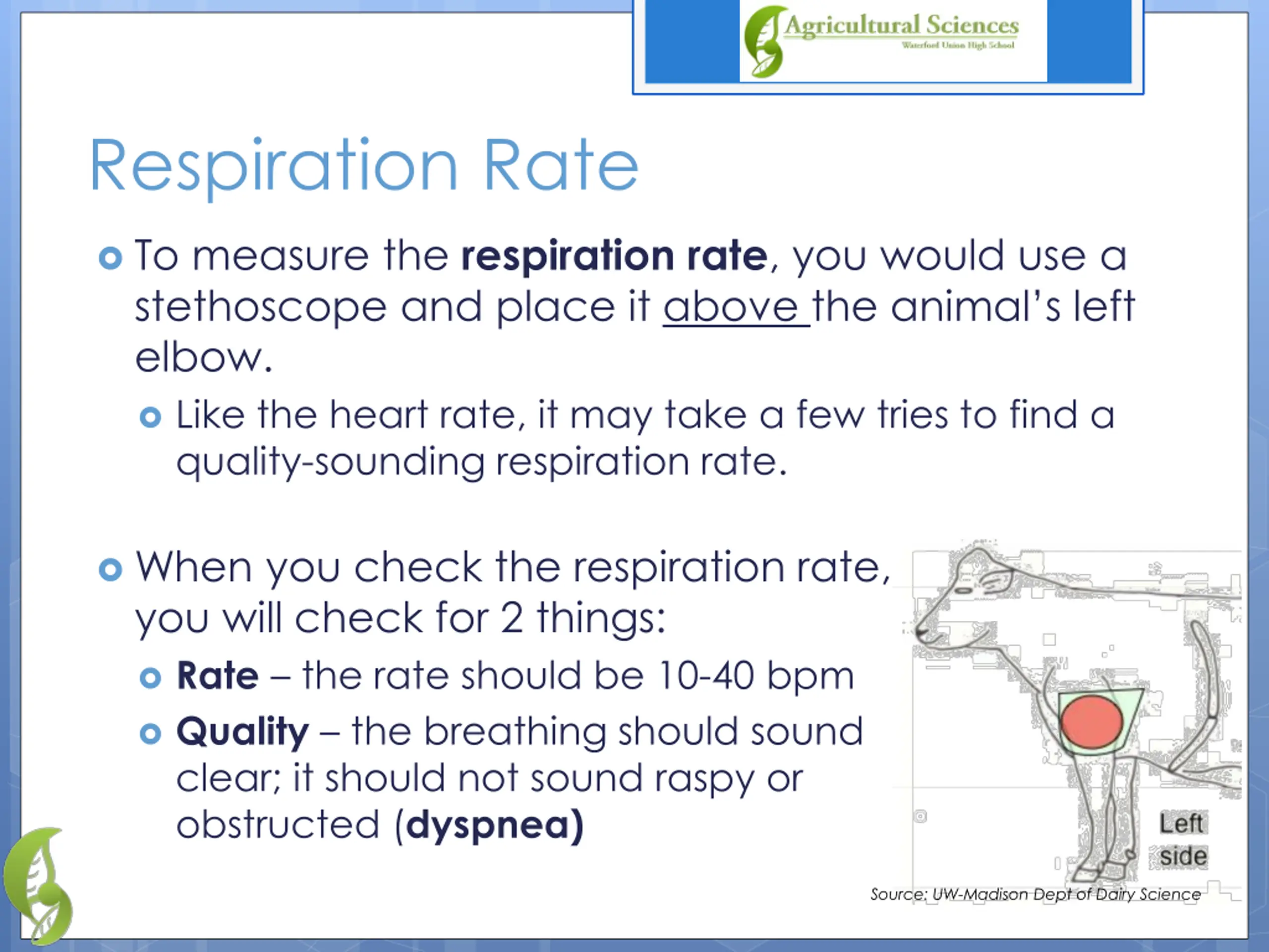Respiration Rate To measure the respiration rate, you would use a stethoscope and place it above the animal s left elbow. Like the heart rate, it may take a few tries to find a quality-sounding respiration rate. When you check the respiration rate, you will check for 2 things: Rate the rate should be 10-40 bpm Quality the breathing should sound clear; it should not sound raspy or obstructed (dyspnea) Source: UW-Madison Dept of Dairy Science