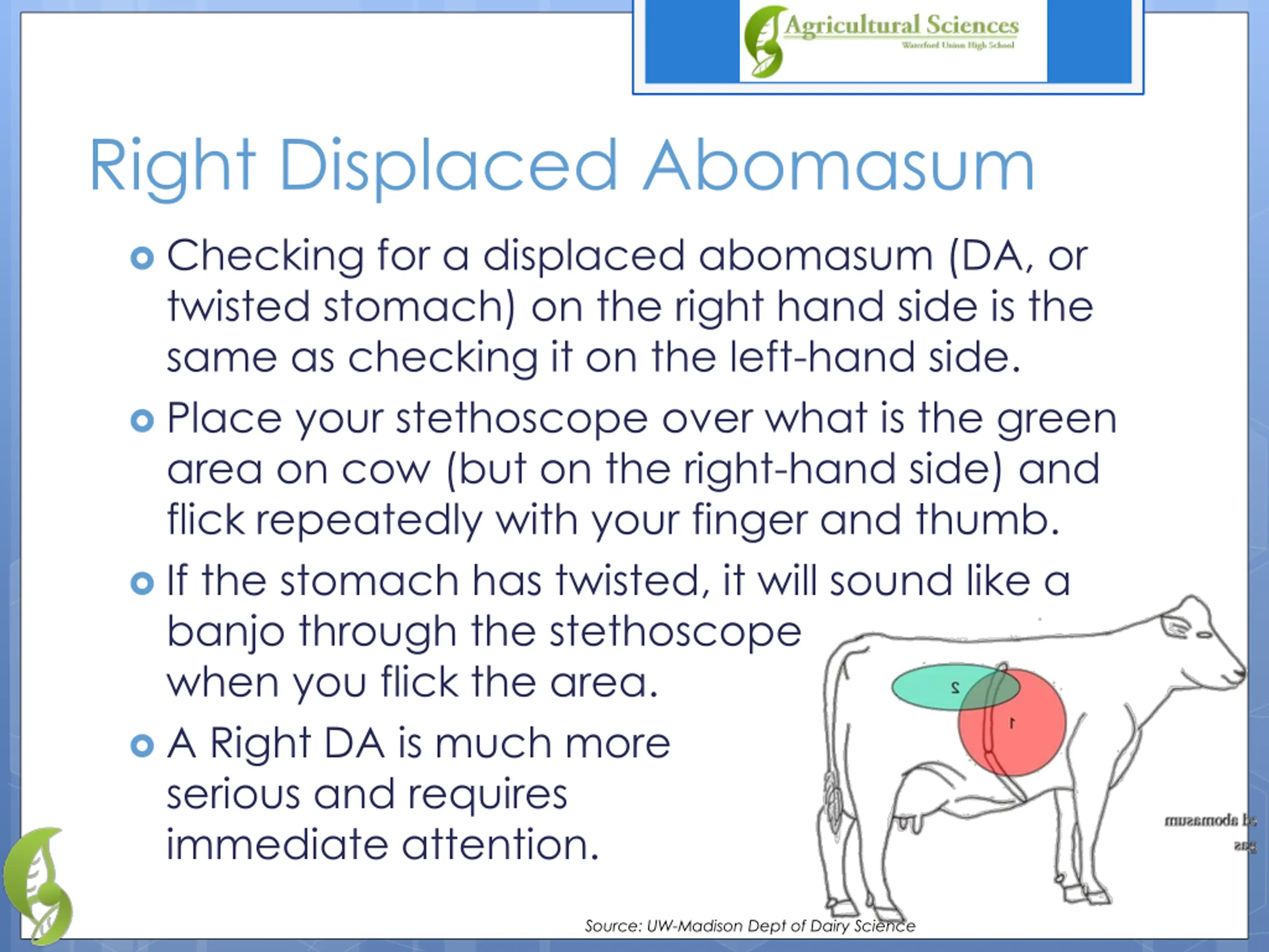 Right Displaced Abomasum Checking for a displaced abomasum (DA, or twisted stomach) on the right hand side is the same as checking it on the left-hand side. Place your stethoscope over what is the green area on cow (but on the right-hand side) and flick repeatedly with your finger and thumb. If the stomach has twisted, it will sound like a banjo through the stethoscope when you flick the area. A Right DA is much more serious and requires immediate attention. Source: UW-Madison Dept of Dairy Science