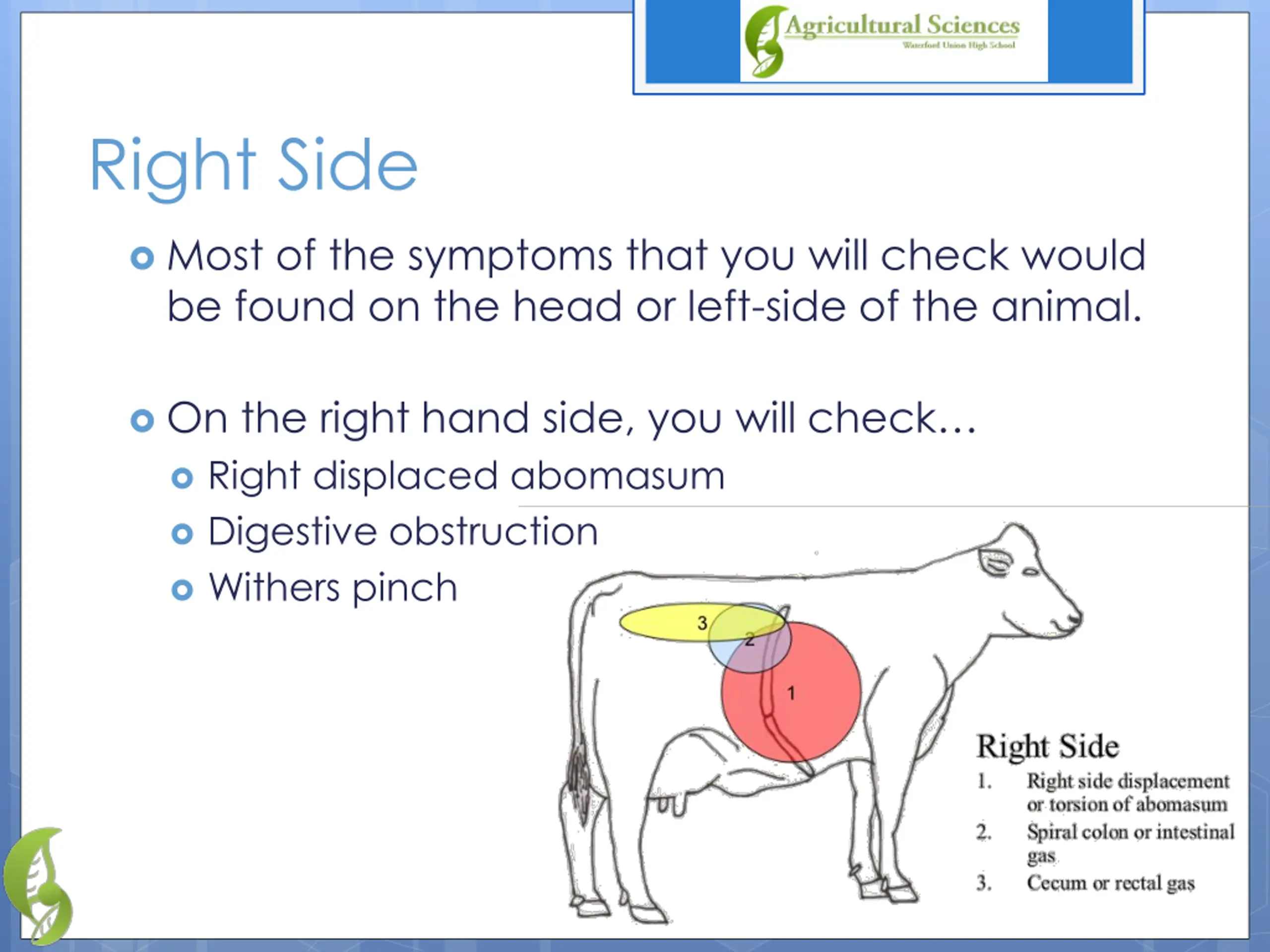 Right Side Most of the symptoms that you will check would be found on the head or left-side of the animal. On the right hand side, you will check Right displaced abomasum Digestive obstruction Withers pinch