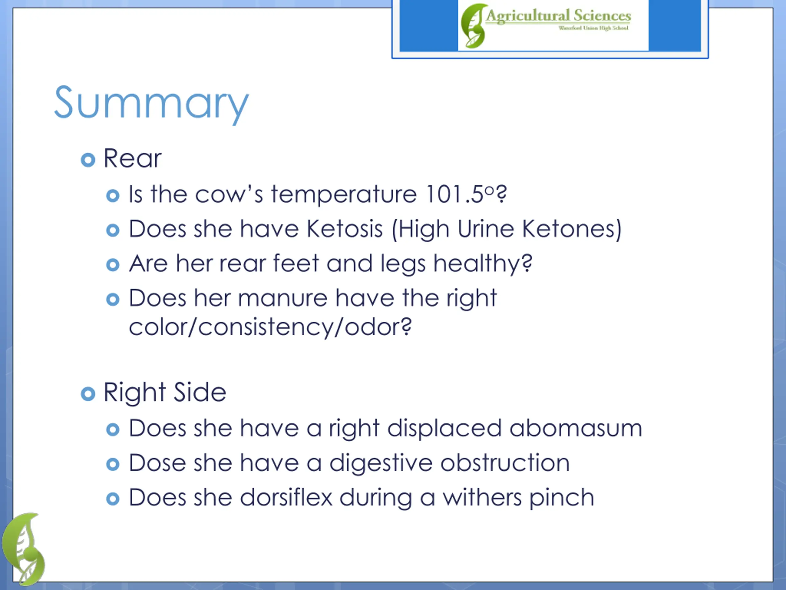 Summary Rear Is the cow s temperature 101.5o? Does she have Ketosis (High Urine Ketones) Are her rear feet and legs healthy? Does her manure have the right color/consistency/odor? Right Side Does she have a right displaced abomasum Dose she have a digestive obstruction Does she dorsiflex during a withers pinch