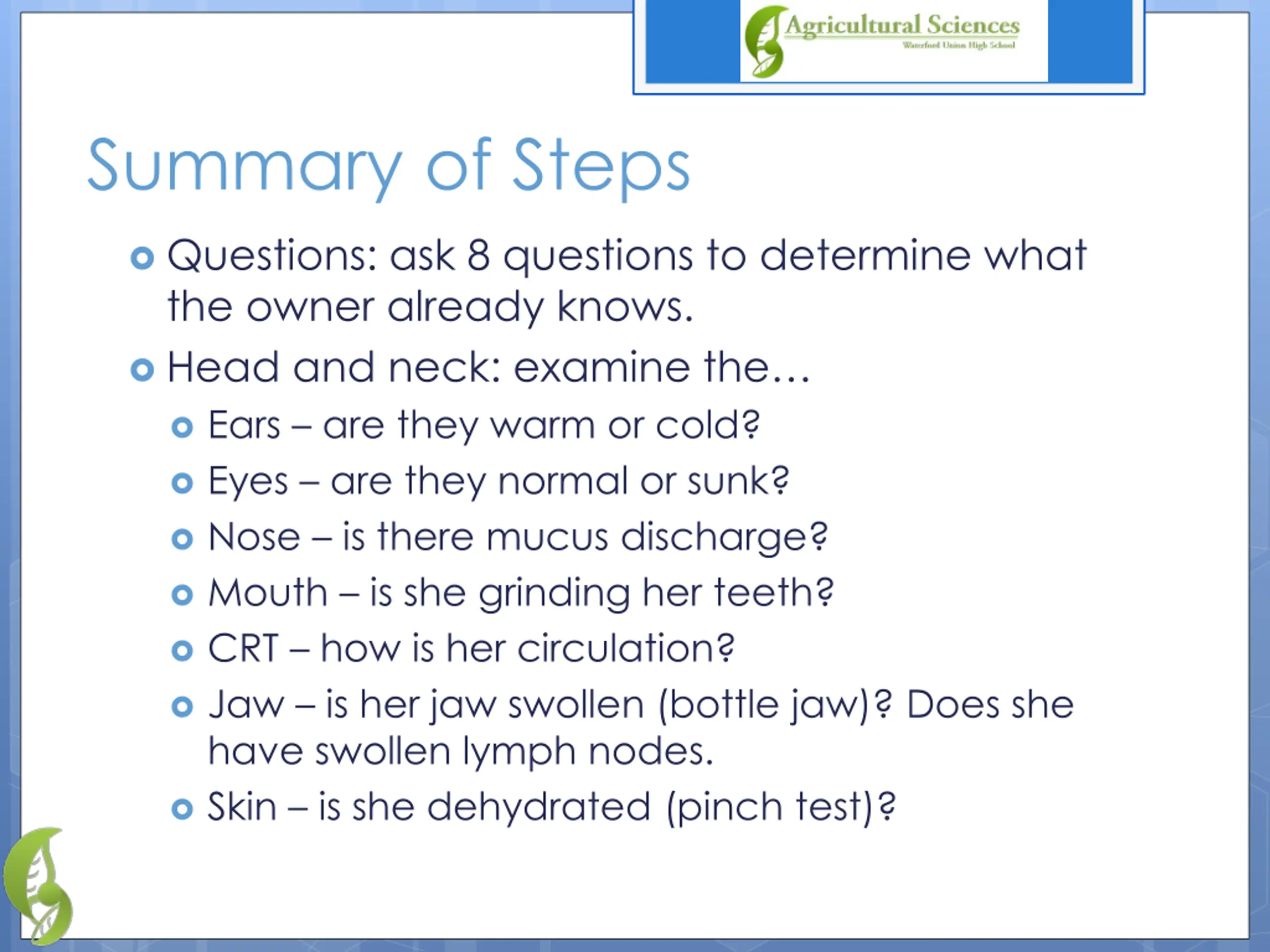 Summary of Steps Questions: ask 8 questions to determine what the owner already knows. Head and neck: examine the Ears are they warm or cold? Eyes are they normal or sunk? Nose is there mucus discharge? Mouth is she grinding her teeth? CRT how is her circulation? Jaw is her jaw swollen (bottle jaw)? Does she have swollen lymph nodes. Skin is she dehydrated (pinch test)?