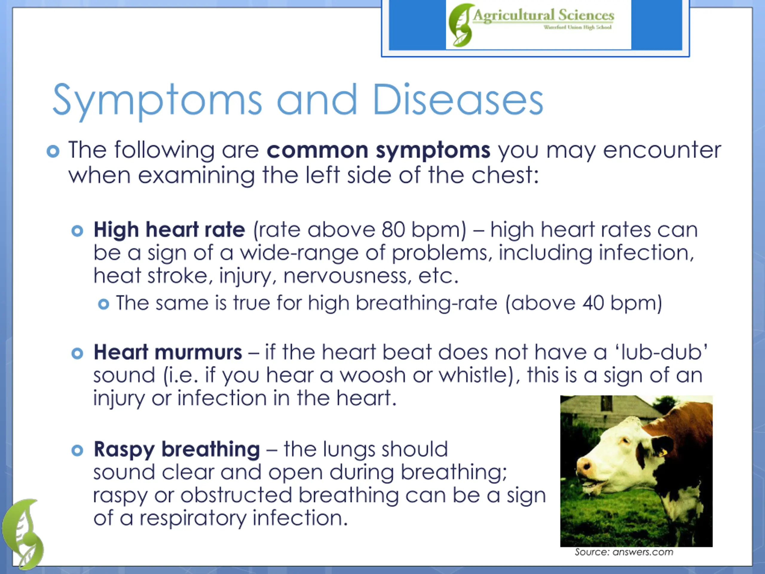 Symptoms and Diseases The following are common symptoms you may encounter when examining the left side of the chest: High heart rate (rate above 80 bpm) high heart rates can be a sign of a wide-range of problems, including infection, heat stroke, injury, nervousness, etc. The same is true for high breathing-rate (above 40 bpm) Heart murmurs if the heart beat does not have a lub-dub sound (i.e. if you hear a woosh or whistle), this is a sign of an injury or infection in the heart. Raspy breathing the lungs should sound clear and open during breathing; raspy or obstructed breathing can be a sign of a respiratory infection. Source: answers.com