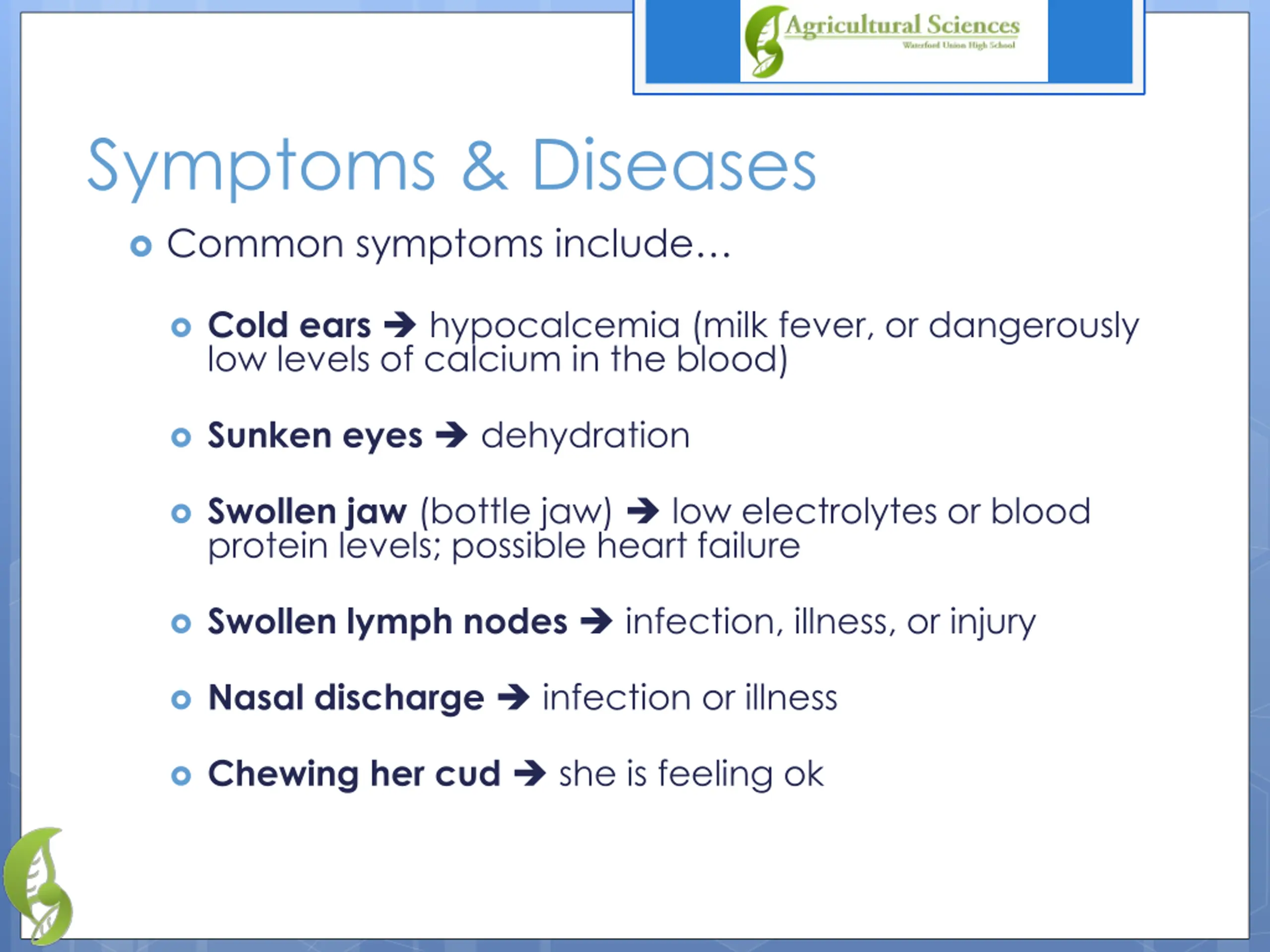 Symptoms & Diseases Common symptoms include Cold ears hypocalcemia (milk fever, or dangerously low levels of calcium in the blood) Sunken eyes dehydration Swollen jaw (bottle jaw) low electrolytes or blood protein levels; possible heart failure Swollen lymph nodes infection, illness, or injury Nasal discharge infection or illness Chewing her cud she is feeling ok