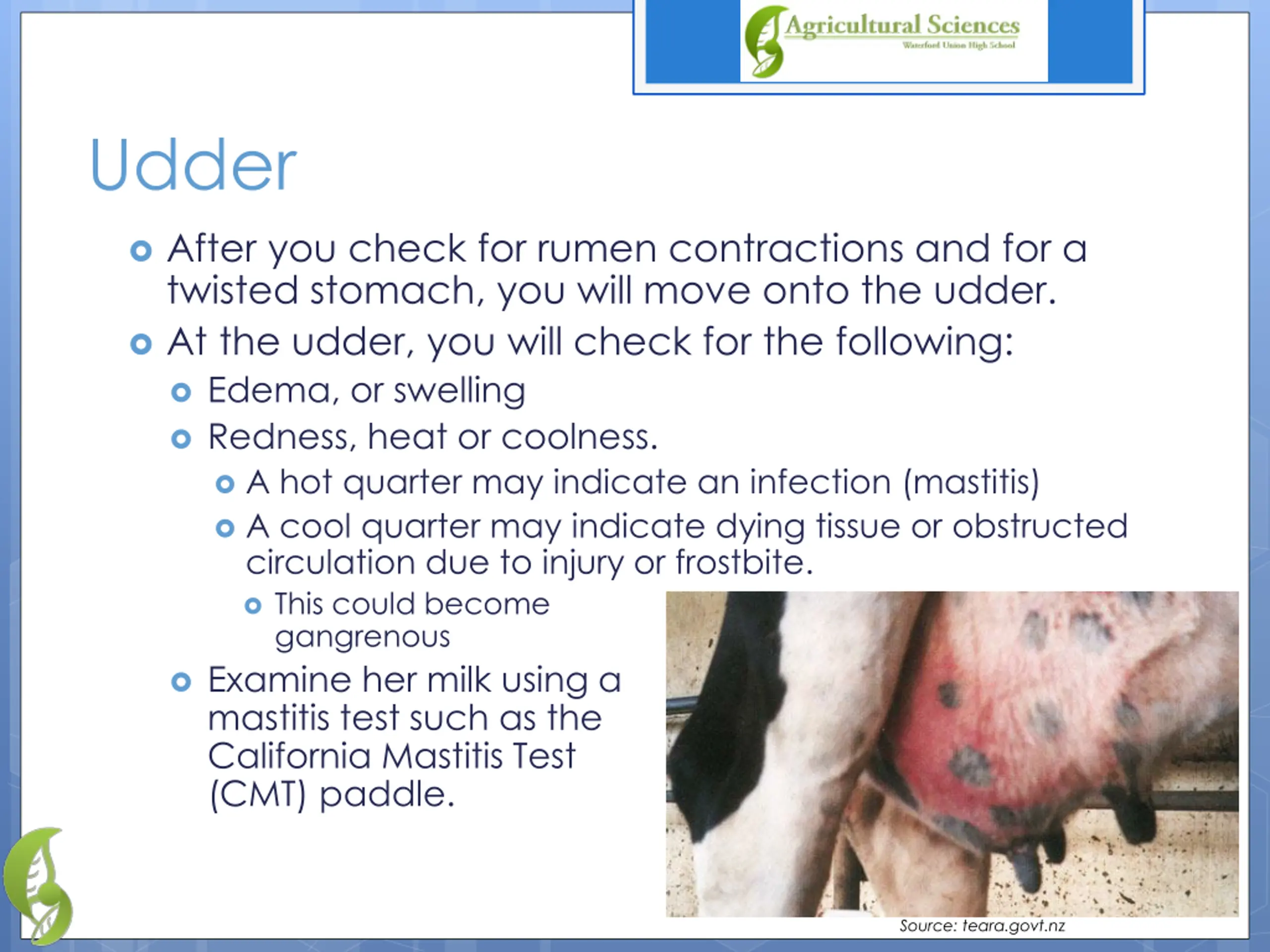 Udder After you check for rumen contractions and for a twisted stomach, you will move onto the udder. At the udder, you will check for the following: Edema, or swelling Redness, heat or coolness. A hot quarter may indicate an infection (mastitis) A cool quarter may indicate dying tissue or obstructed circulation due to injury or frostbite. This could become gangrenous Examine her milk using a mastitis test such as the California Mastitis Test (CMT) paddle. Source: teara.govt.nz