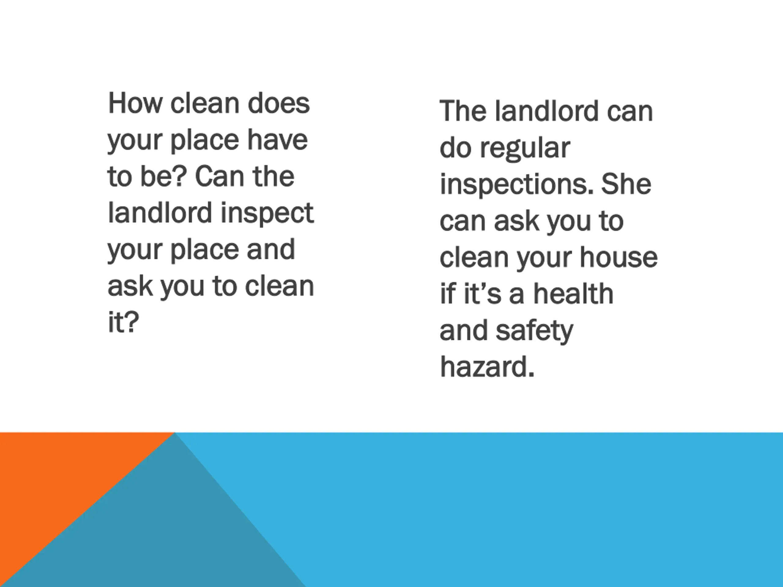 How clean does How clean does your place have your place have to be? Can the to be? Can the landlord inspect landlord inspect your place and your place and ask you to clean ask you to clean it? it? The landlord can The landlord can do regular do regular inspections. She inspections. She can ask you to can ask you to clean your house clean your house if it s a health if it s a health and safety and safety hazard. hazard.