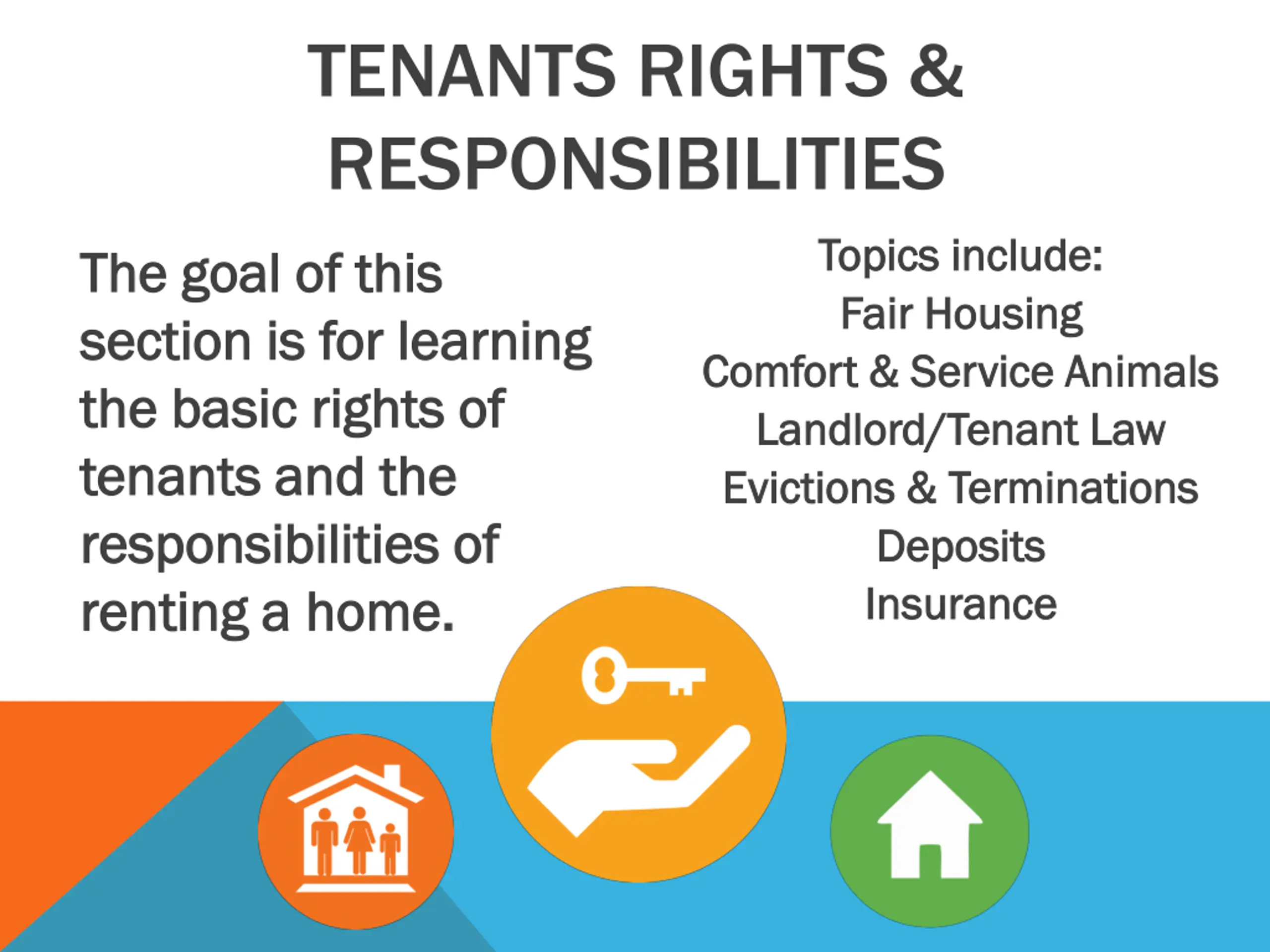 TENANTS RIGHTS & RESPONSIBILITIES Topics include: Topics include: Fair Housing Fair Housing Comfort & Service Animals Comfort & Service Animals Landlord/Tenant Law Landlord/Tenant Law Evictions & Terminations Evictions & Terminations Deposits Deposits Insurance Insurance The goal of this The goal of this section is for learning section is for learning the basic rights of the basic rights of tenants and the tenants and the responsibilities of responsibilities of renting a home. renting a home.