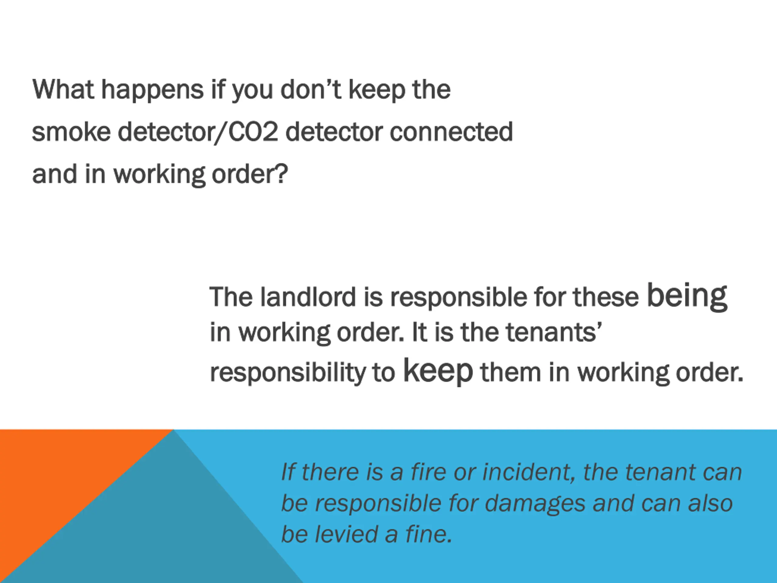 What happens if you dont keep the What happens if you don t keep the smoke detector/CO2 detector connected smoke detector/CO2 detector connected and in working order? and in working order? The landlord is responsible for these The landlord is responsible for these being in working order. It is the tenants in working order. It is the tenants responsibility to responsibility to keep keep them in working order. them in working order. being If there is a fire or incident, the tenant can be responsible for damages and can also be levied a fine.
