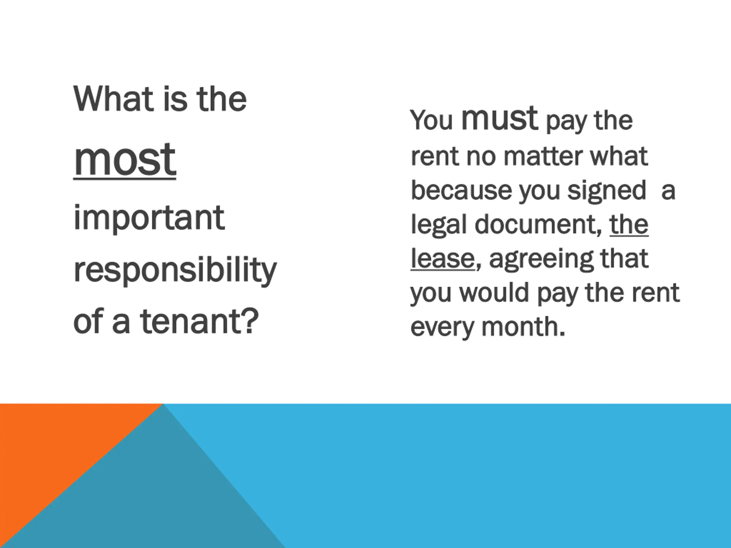 What is the What is the most most important important responsibility responsibility of a tenant? of a tenant? You You must must pay the rent no matter what rent no matter what because you signed a because you signed a legal document, legal document, the lease lease, agreeing that , agreeing that you would pay the rent you would pay the rent every month. every month. pay the the