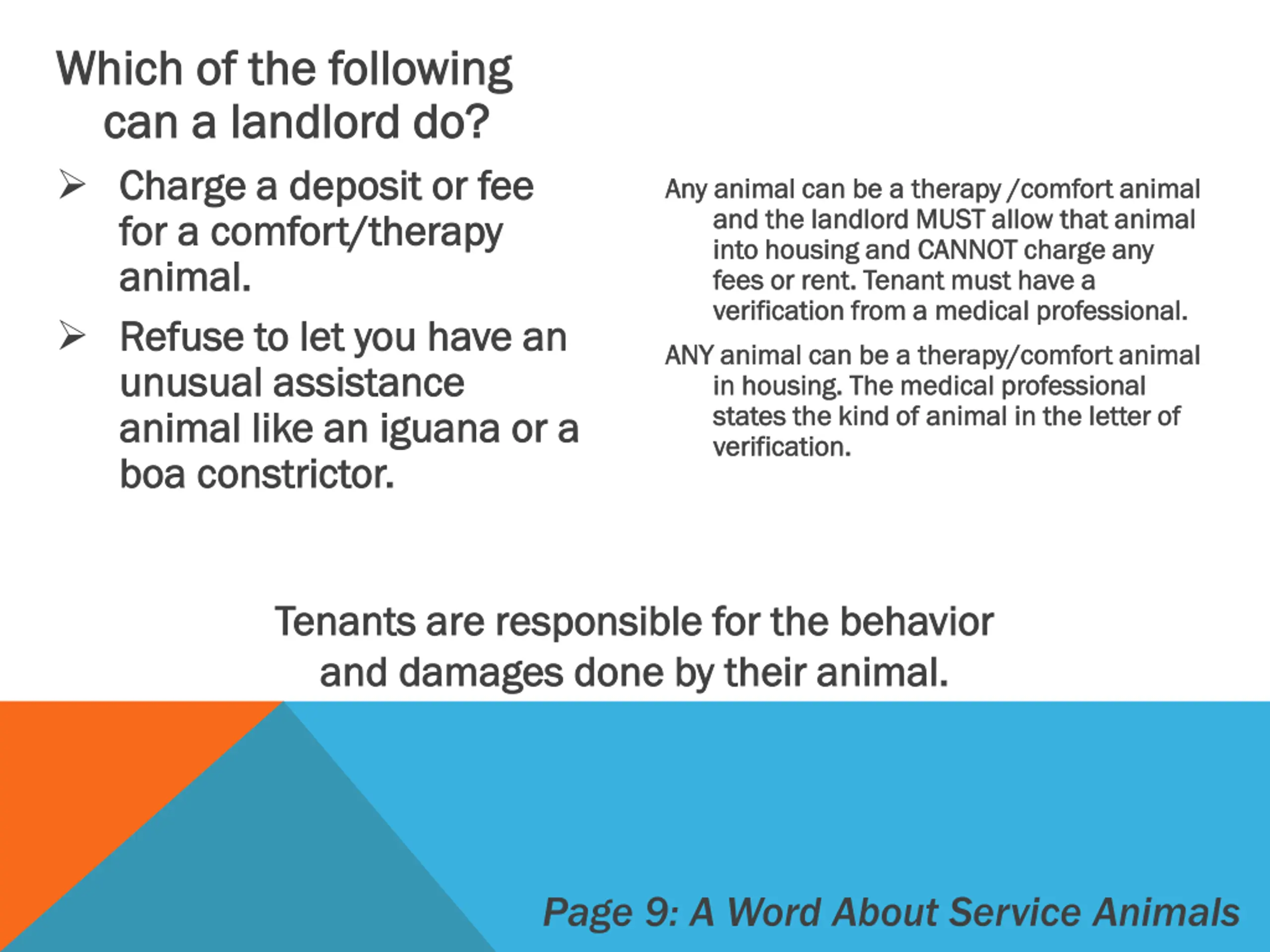 Which of the following Which of the following can a landlord do? can a landlord do? Charge a deposit or fee Charge a deposit or fee for a comfort/therapy for a comfort/therapy animal. animal. Refuse to let you have an Refuse to let you have an unusual assistance unusual assistance animal like an iguana or a animal like an iguana or a boa constrictor. boa constrictor. Any animal can be a therapy /comfort animal Any animal can be a therapy /comfort animal and the landlord MUST allow that animal and the landlord MUST allow that animal into housing and CANNOT charge any into housing and CANNOT charge any fees or rent. Tenant must have a fees or rent. Tenant must have a verification from a medical professional. verification from a medical professional. ANY animal can be a therapy/comfort animal ANY animal can be a therapy/comfort animal in housing. The medical professional in housing. The medical professional states the kind of animal in the letter of states the kind of animal in the letter of verification. verification. Tenants are responsible for the behavior Tenants are responsible for the behavior and damages done by their animal. and damages done by their animal. Page 9: A Word About Service Animals