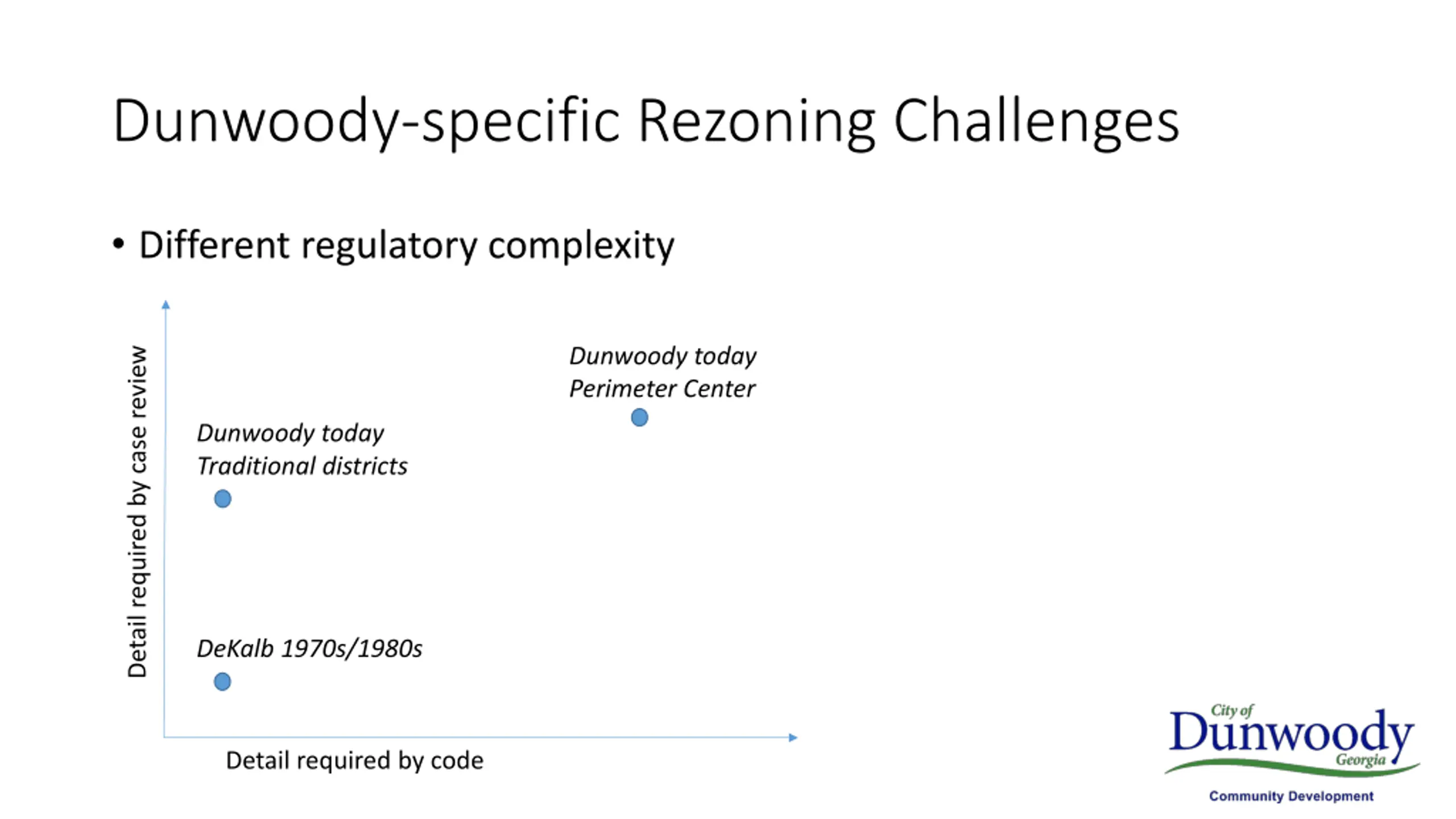 Dunwoody-specific Rezoning Challenges Different regulatory complexity Dunwoody today Perimeter Center Detail required by case review Dunwoody today Traditional districts DeKalb 1970s/1980s Detail required by code